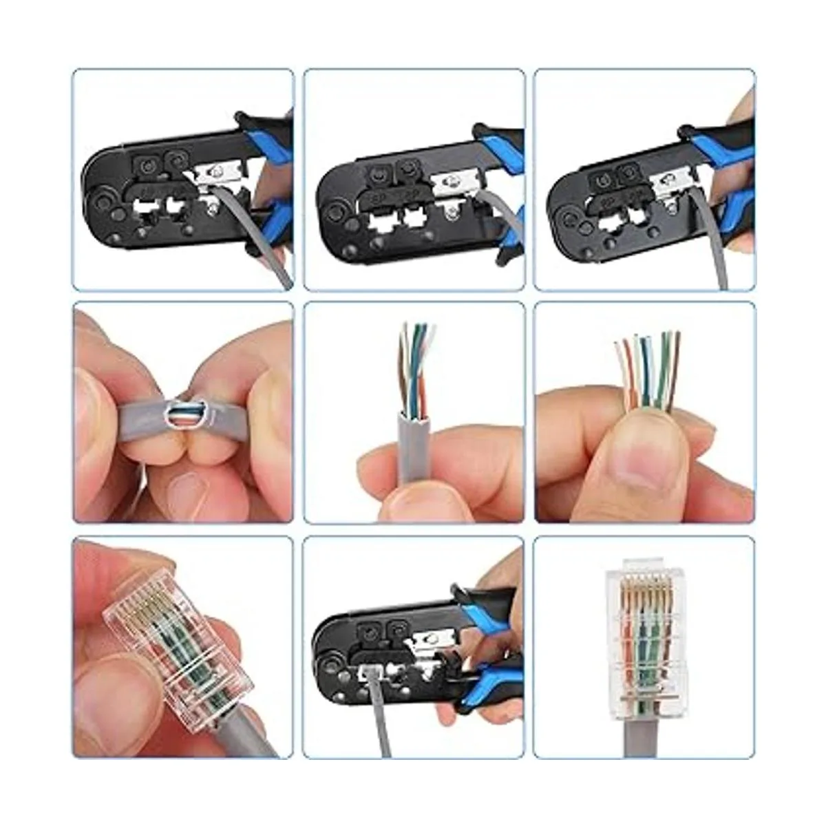 RJ45 Kit de herramientas de prensado Ethernet, RJ11, 6PRJ12, 8PRJ45, herramienta de crimpado, corte y tira con 20 conectores RJ45 CAT5 CAT5e, 20 cubiertas, 1 probador de cables de red y 1 pelacables