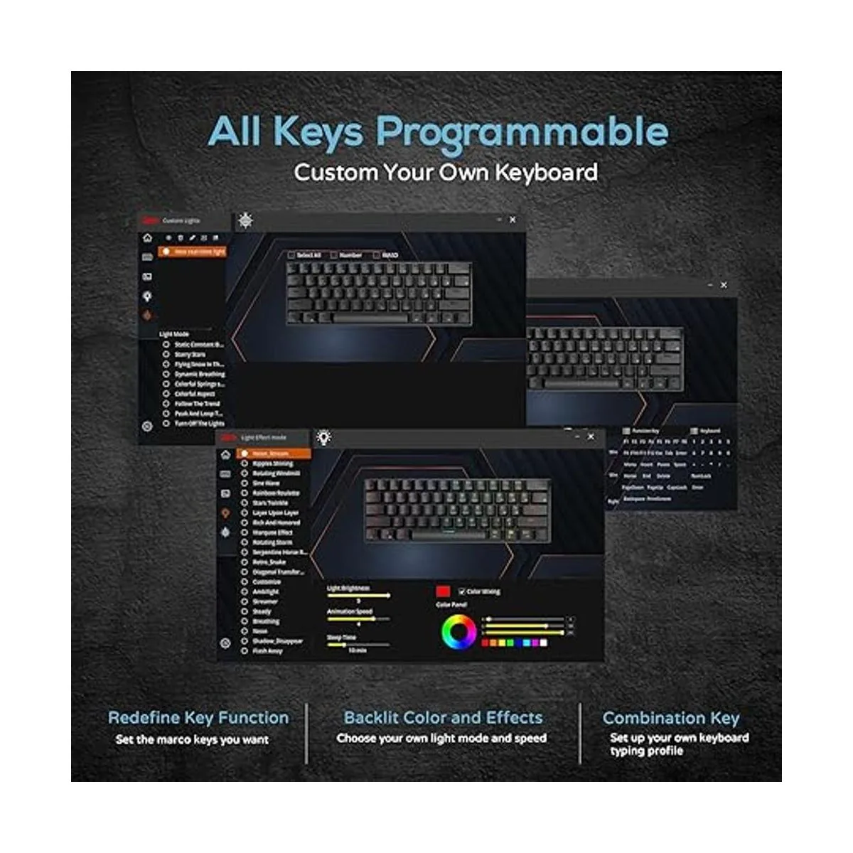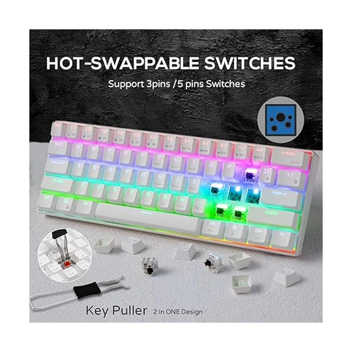 Retroiluminación RGB: este teclado mecánico personalizado del 60 tiene 18 modos de retroiluminación RGB, 8 modos de retroiluminación monocromática y 1 retroiluminación a todo color. Estos modos de luz pueden proporcionarte un entorno de juego encantador por la noche.