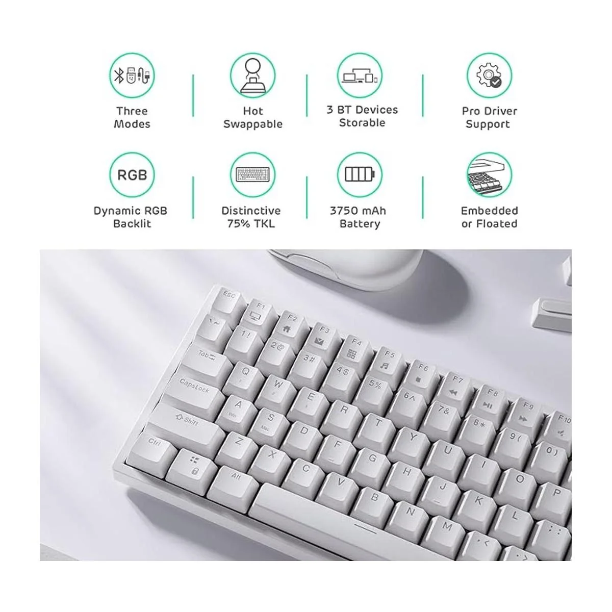 Tres modos: Lo creas o no, esta es la primera generación de teclados inalámbricos RGB de tres modos en el mercado. Modo inalámbrico con Bluetooth 5.0 estable, dongle de 2.4 GHz sin complicaciones y modo con cable USBC sin límites sobre la conexión de tu teclado.