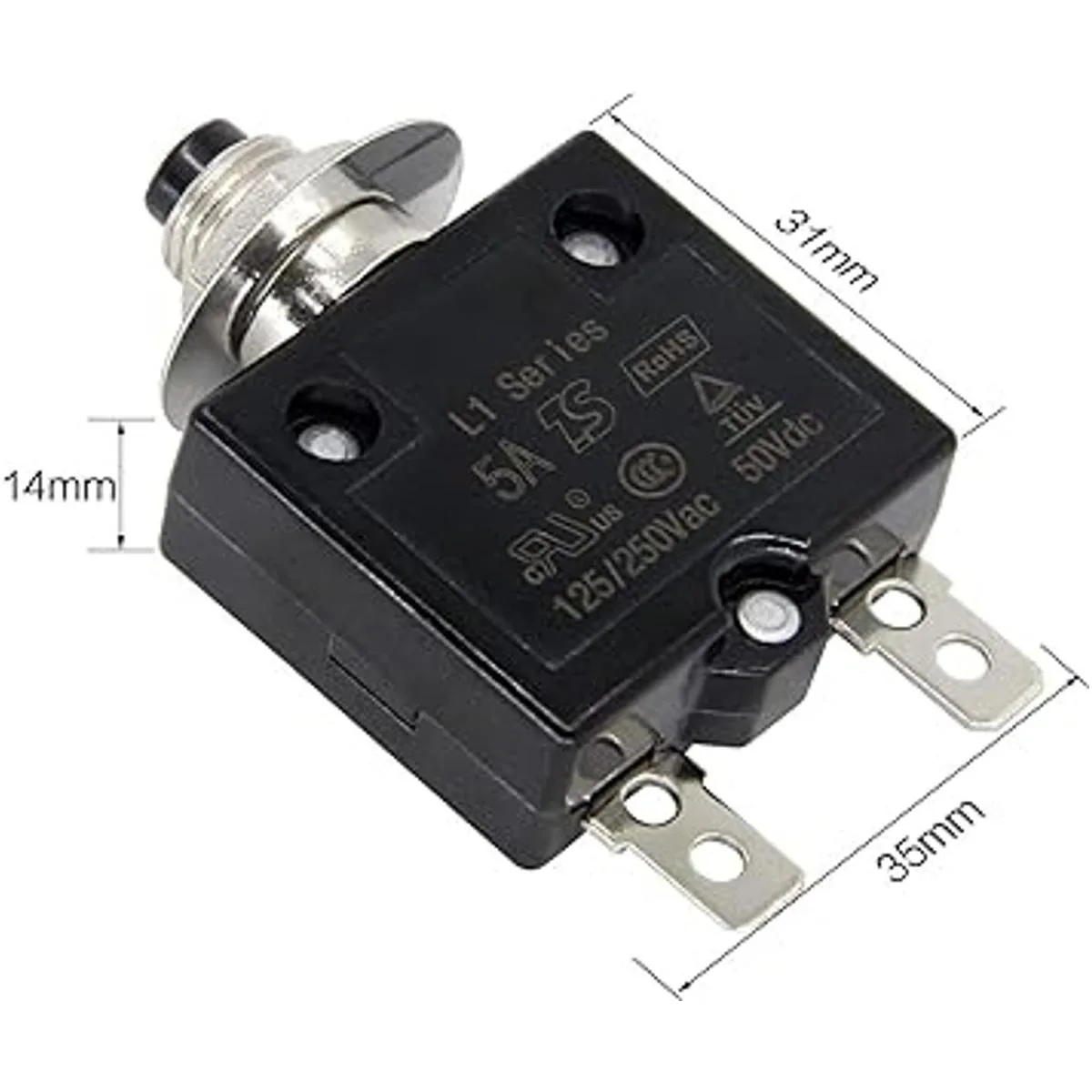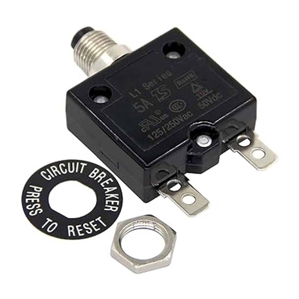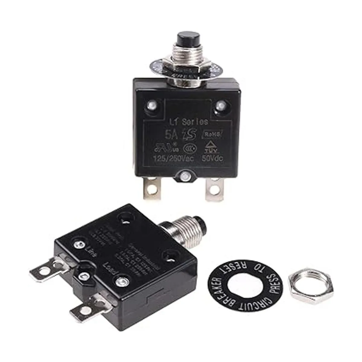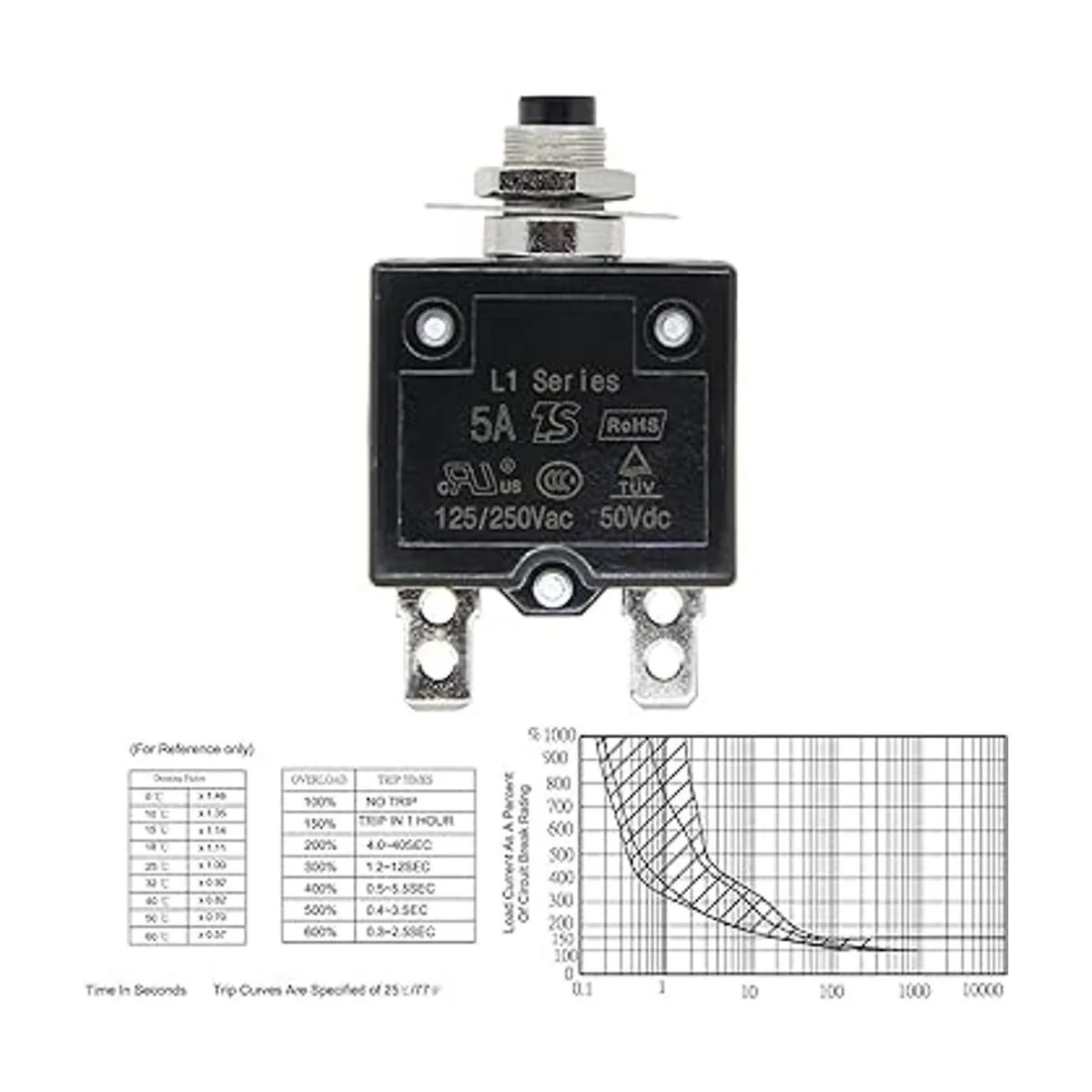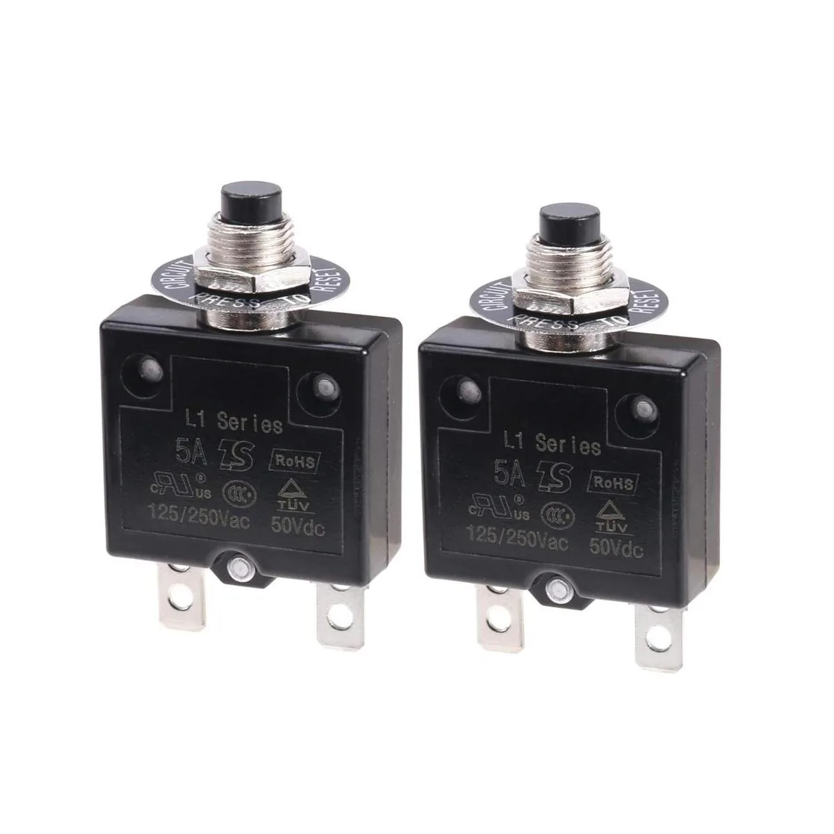 RKURCK Disyuntor de circuito térmico de 5 amperios, protector de sobrecarga térmica serie L1 125 250 V CA 50 V DC Pulsador de botón de reinicio manual Interruptor de circuito 5 A 2 piezas