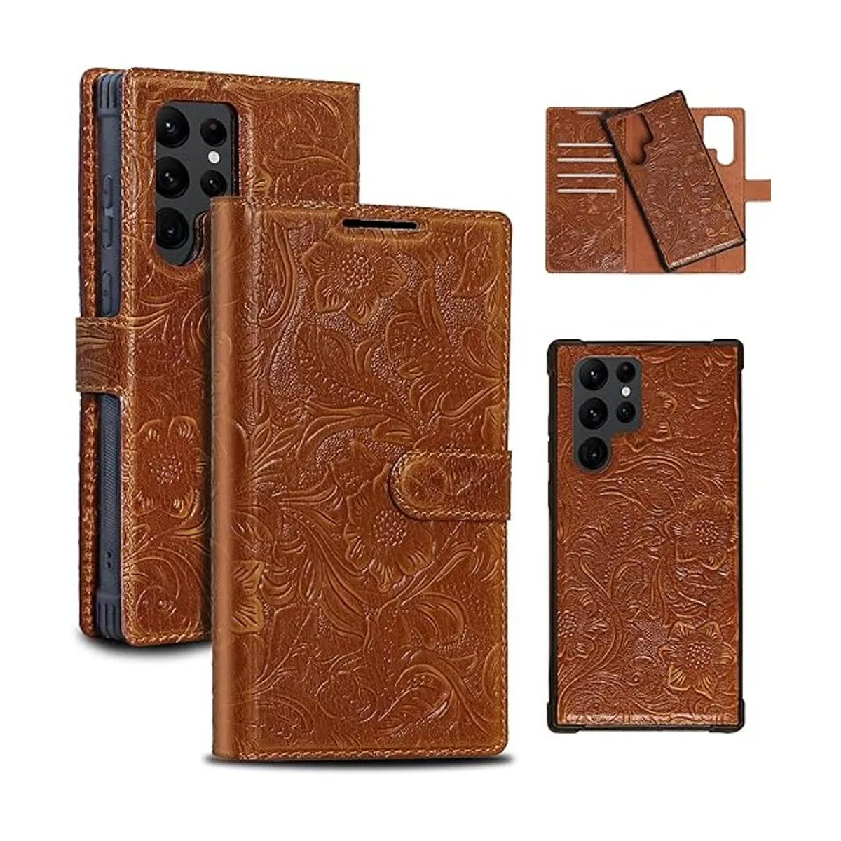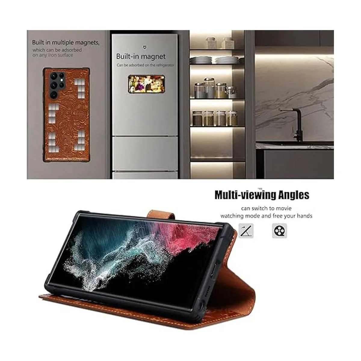 Rmawrad Funda tipo cartera para Samsung Galaxy S22 Ultra Real de piel auténtica, 2 en 1, magnética desmontable a prueba de golpes, con ranura para tarjetas, carga inalámbrica bloqueo RFID marrón