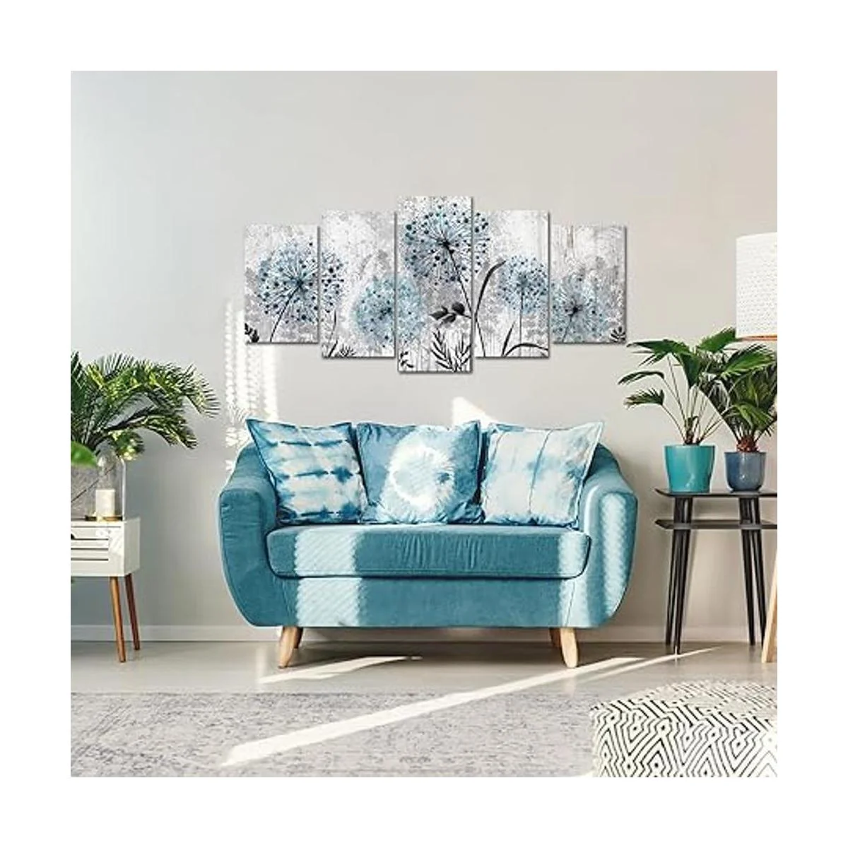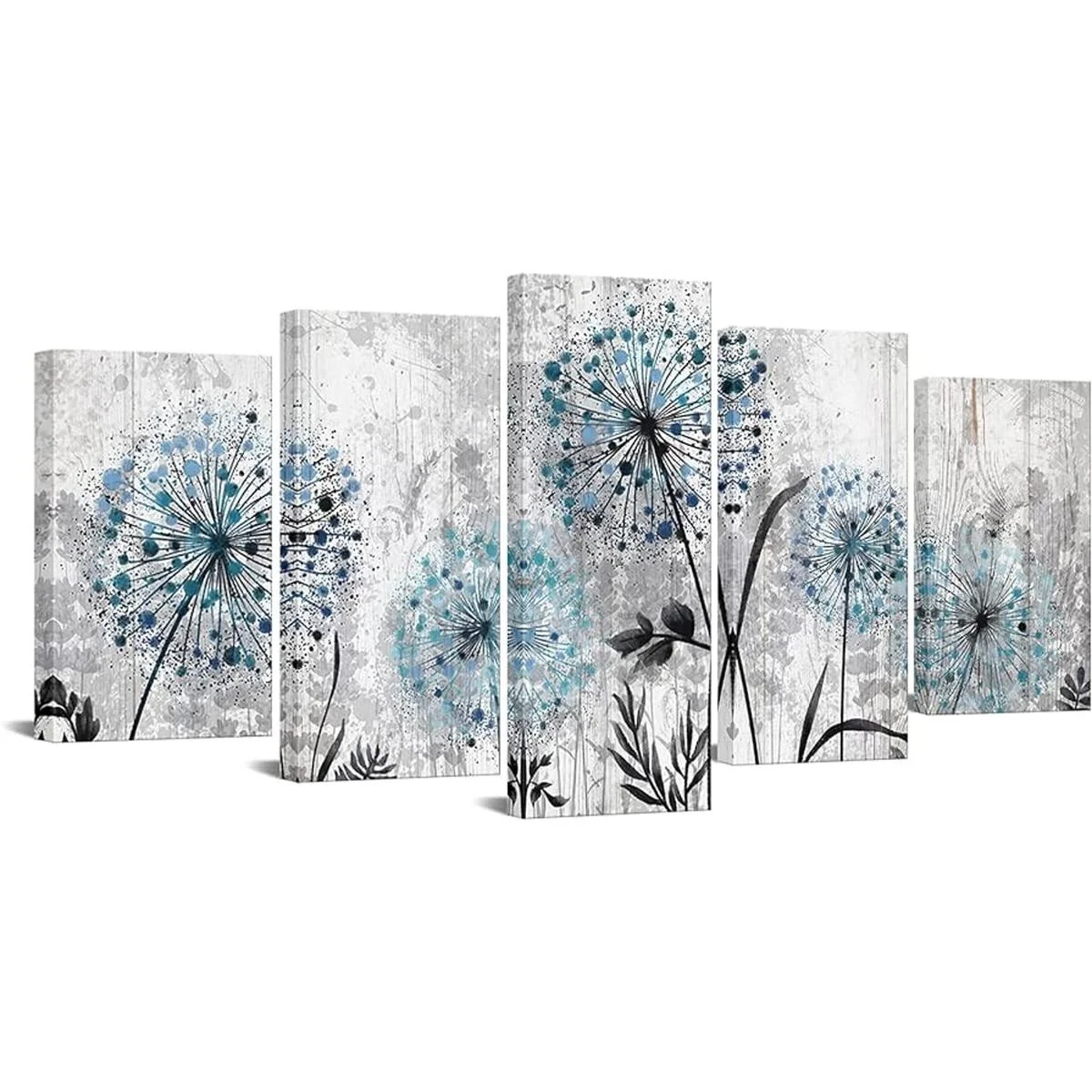 RnnJoile 5 piezas de arte de pared de diente de león rústico azul floral para decoración de casa de campo o oficina, color gris, listo para colgar