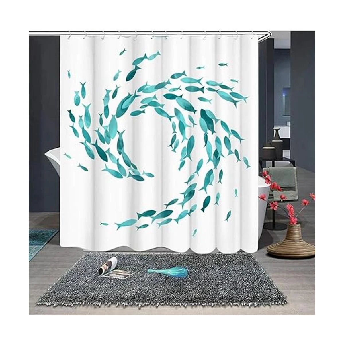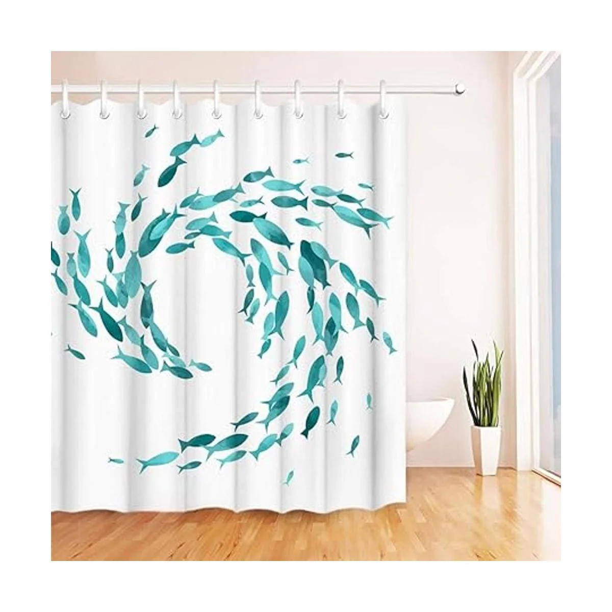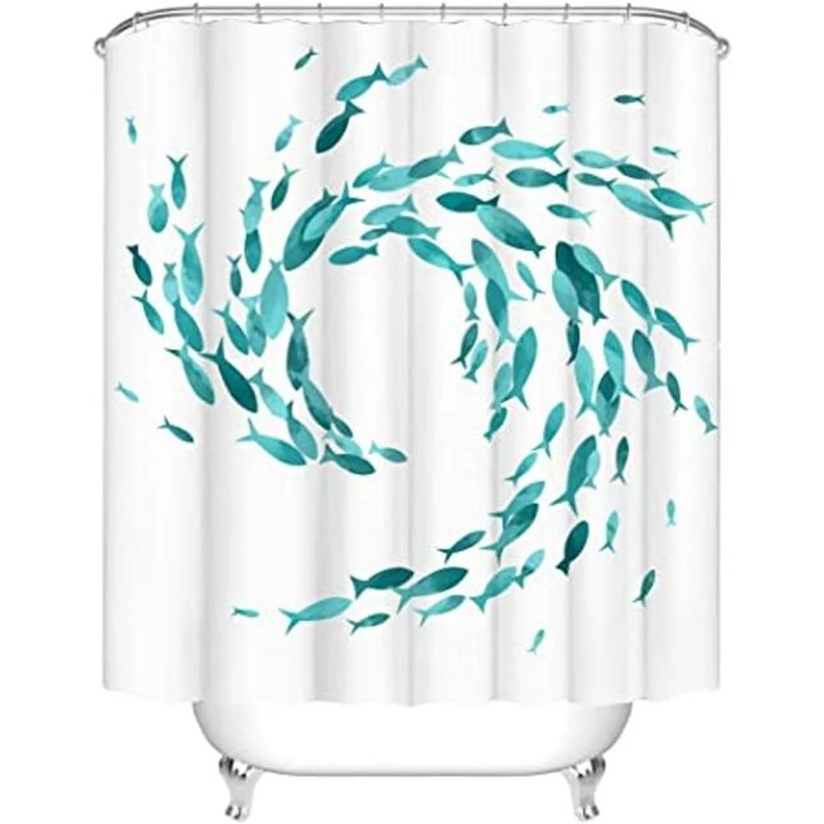 RnnJoile Juego de cortinas de ducha con diseño de peces de color verde azulado, decoración de baño, cortina de ducha con ganchos, color turquesa, 72 x 72 pulgadas