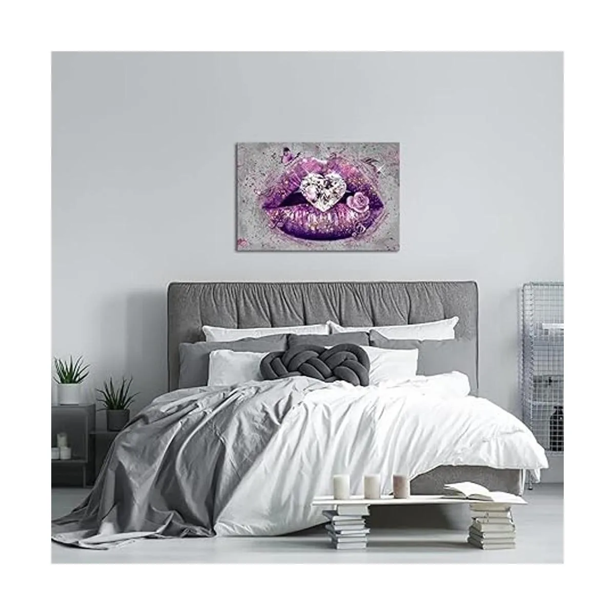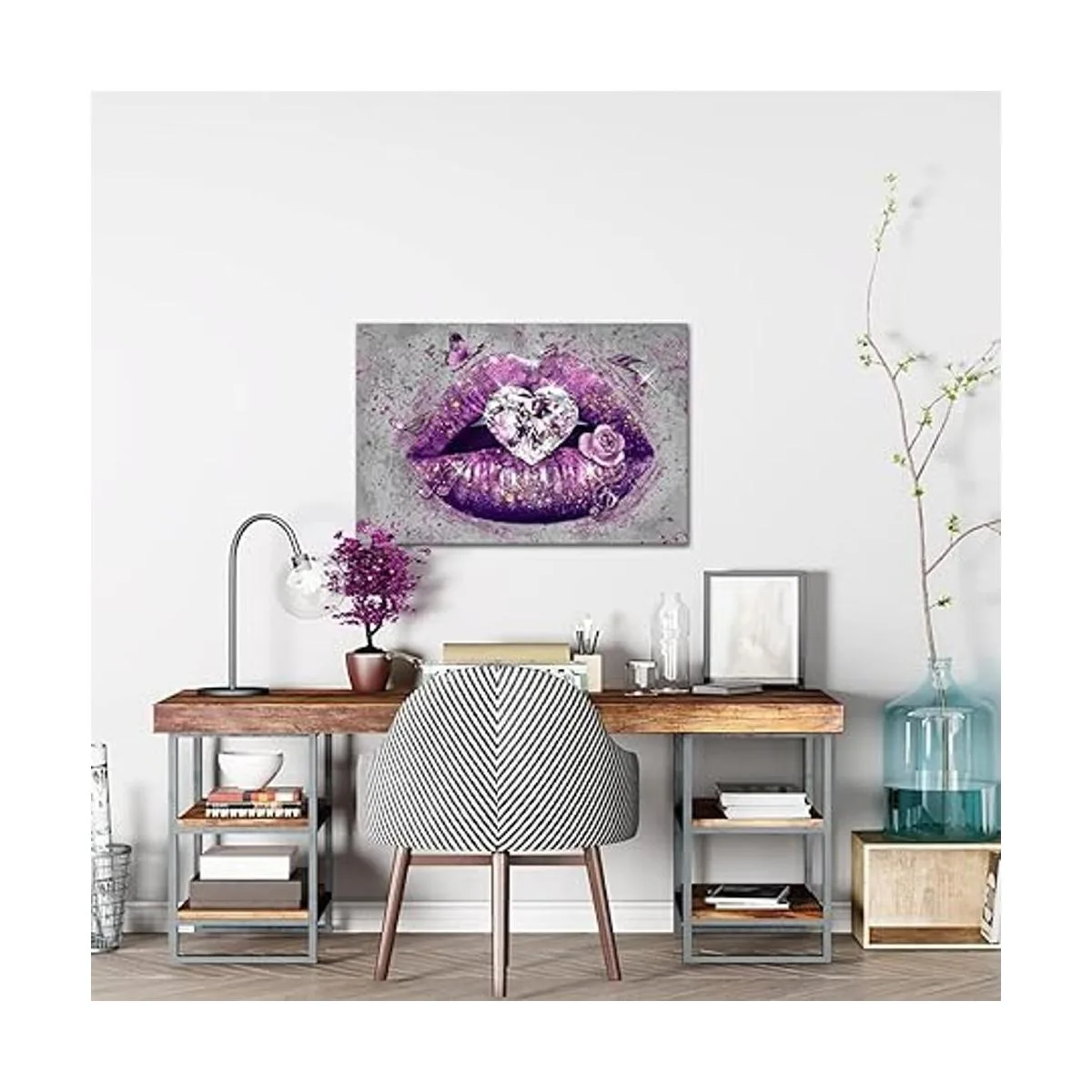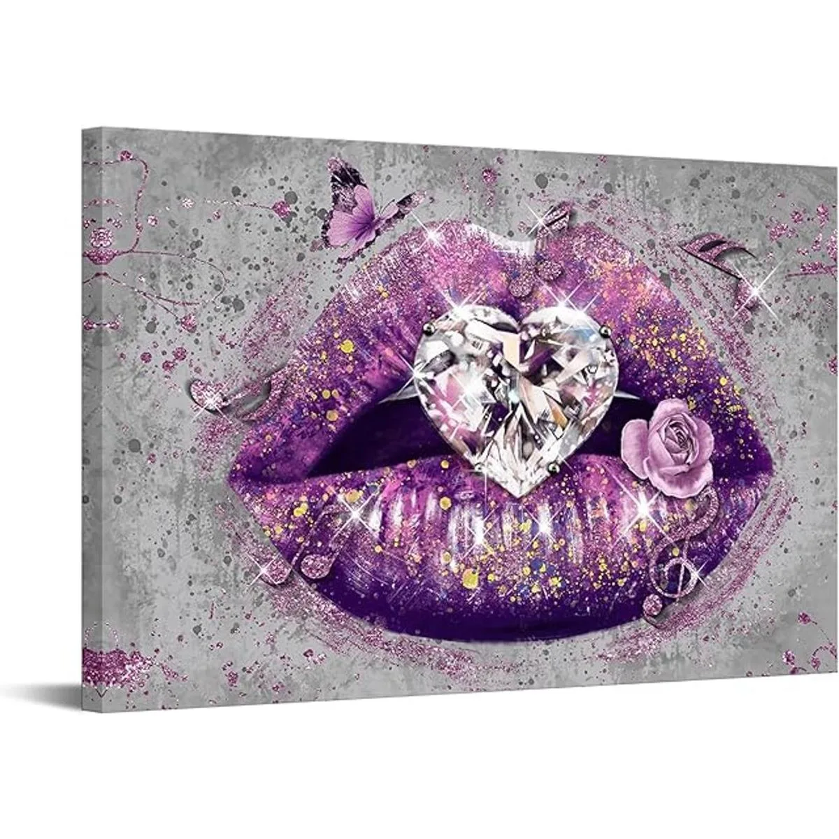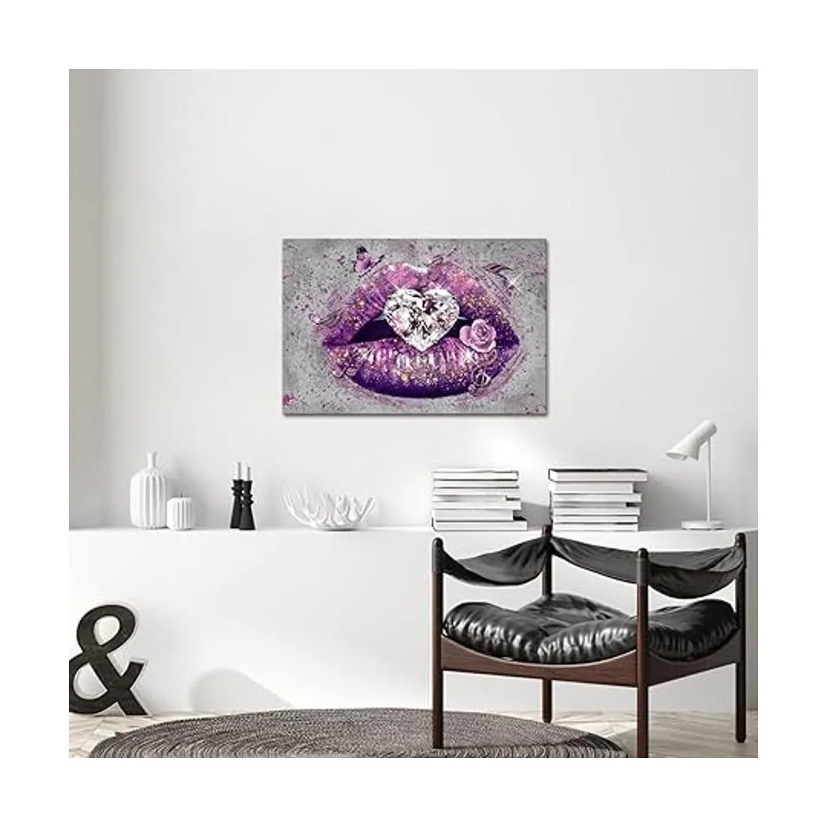 RnnJoile Lienzo decorativo para pared con forma de corazón en forma de corazón con diamante en la boca, pintura de arte púrpura envuelta en galería para dormitorio, sala de estar, decoración lista para colgar 24 x 36 pulgadas