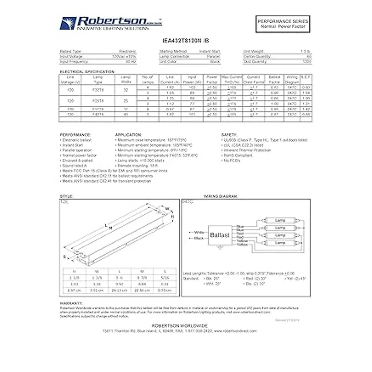 ROBERTSON 1P20135 IEA432T8120N B Paquete original de 10 balastros fluorescentes para 4 lámparas lineales F32T8, arranque instantáneo, 120 VCA, NPF, 60Hz, Factor de balastro normal