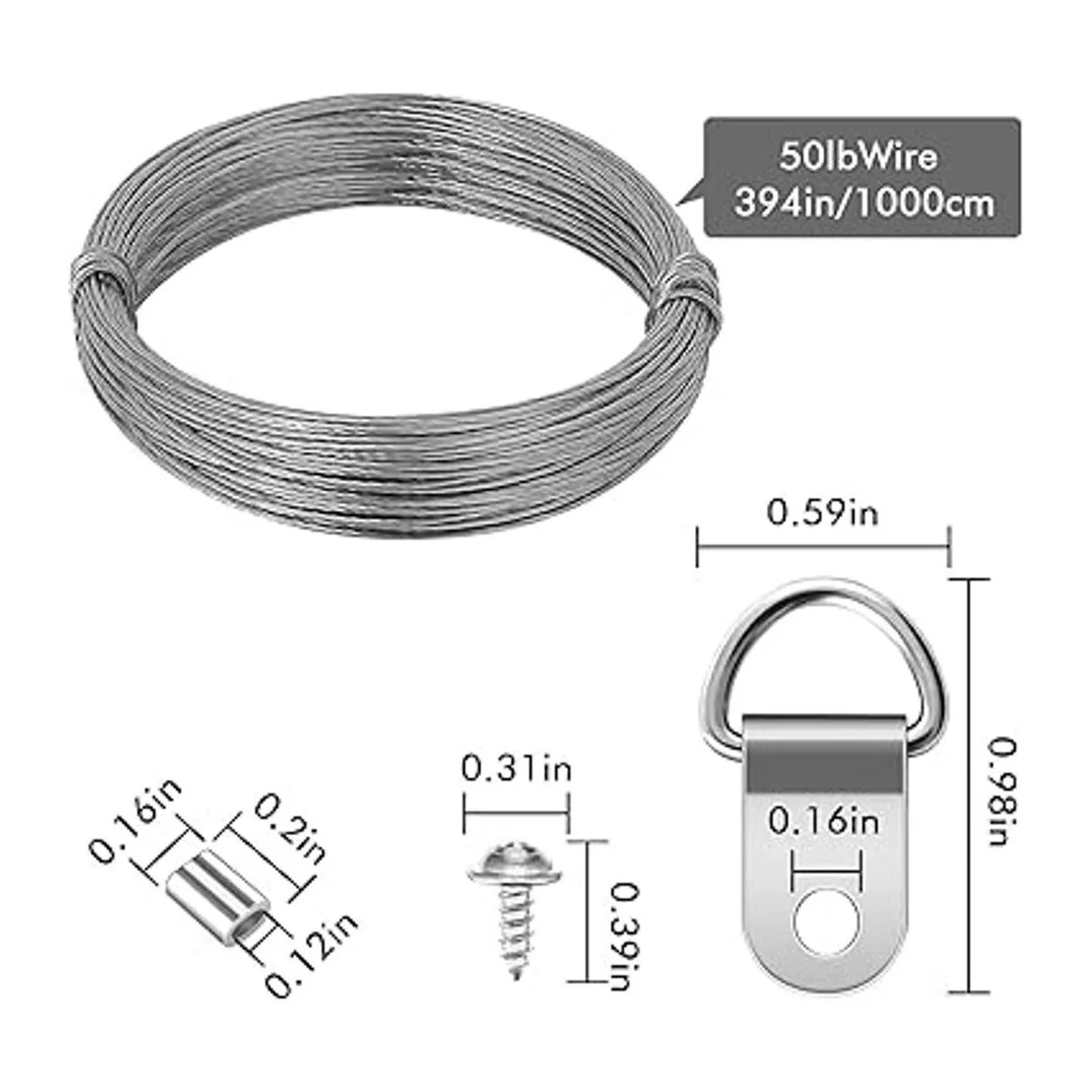 Alta calidad: el alambre para colgar consta de 7 pequeños cables delgados individuales, robustos y duraderos, con una carga máxima de 30 libras. El colgador de anillo en D y los tornillos están hechos de metal niquelado para mayor durabilidad.