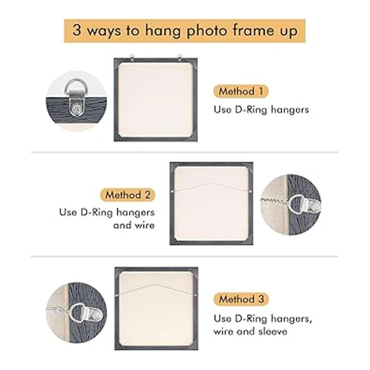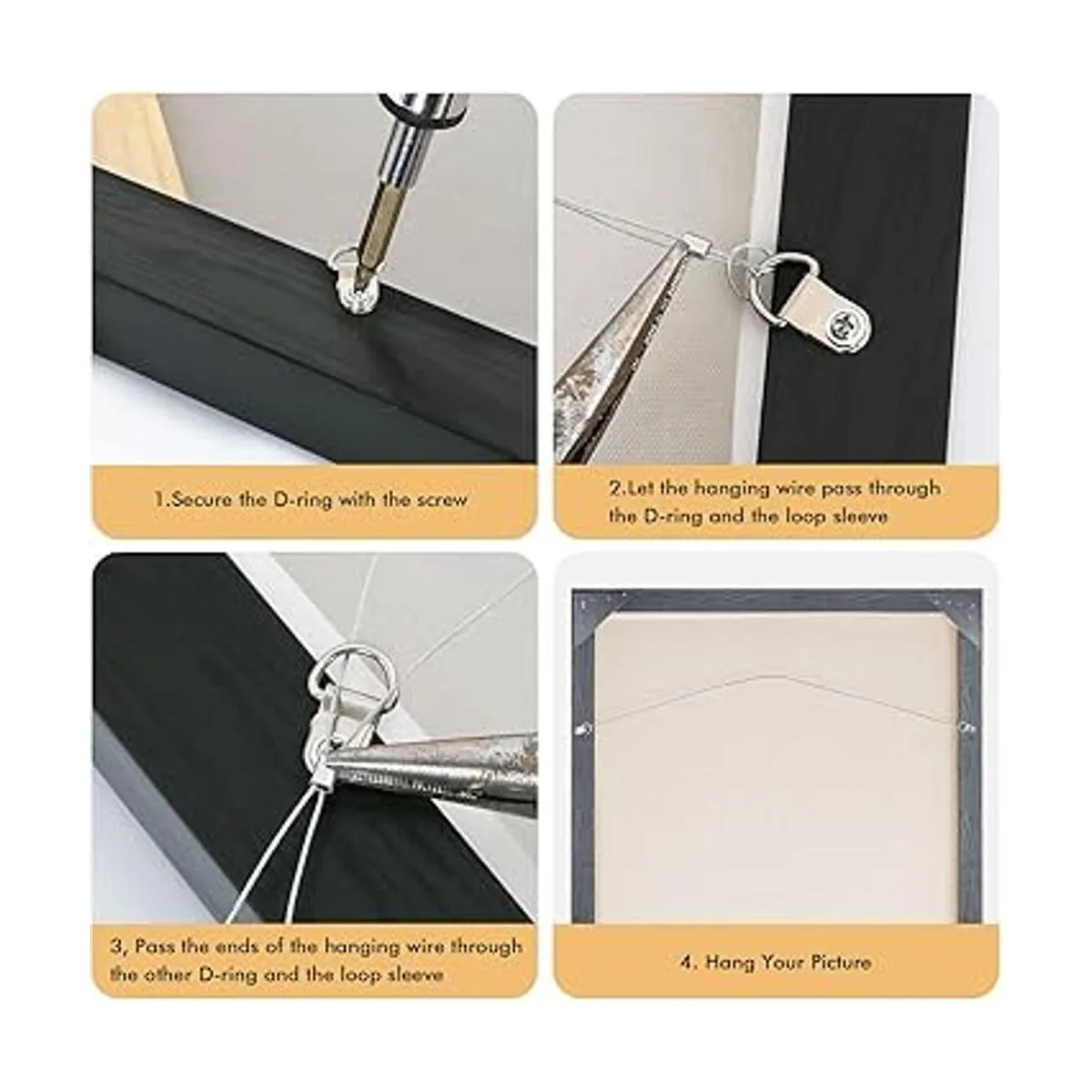Fácil instalación: cada anillo en D se suministra con tornillos que simplemente se atornillan en el marco. Nuestros kits para colgar tienen 3 formas de colgar los marcos, por lo que es fácil de usar.