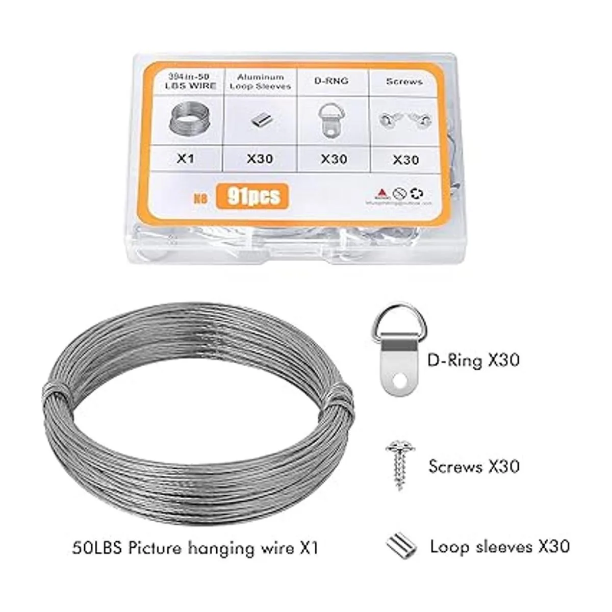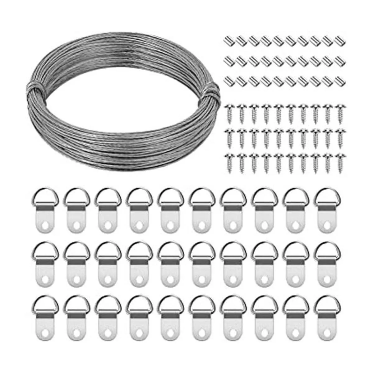 Accesorios para colgar imágenes: kit esencial para colgar cuadros para una decoración de pared rápida y fácil. Anillo 30 D, 30 tornillos, 30 mangas de bucle y 1 alambre en una caja transparente para un fácil almacenamiento.