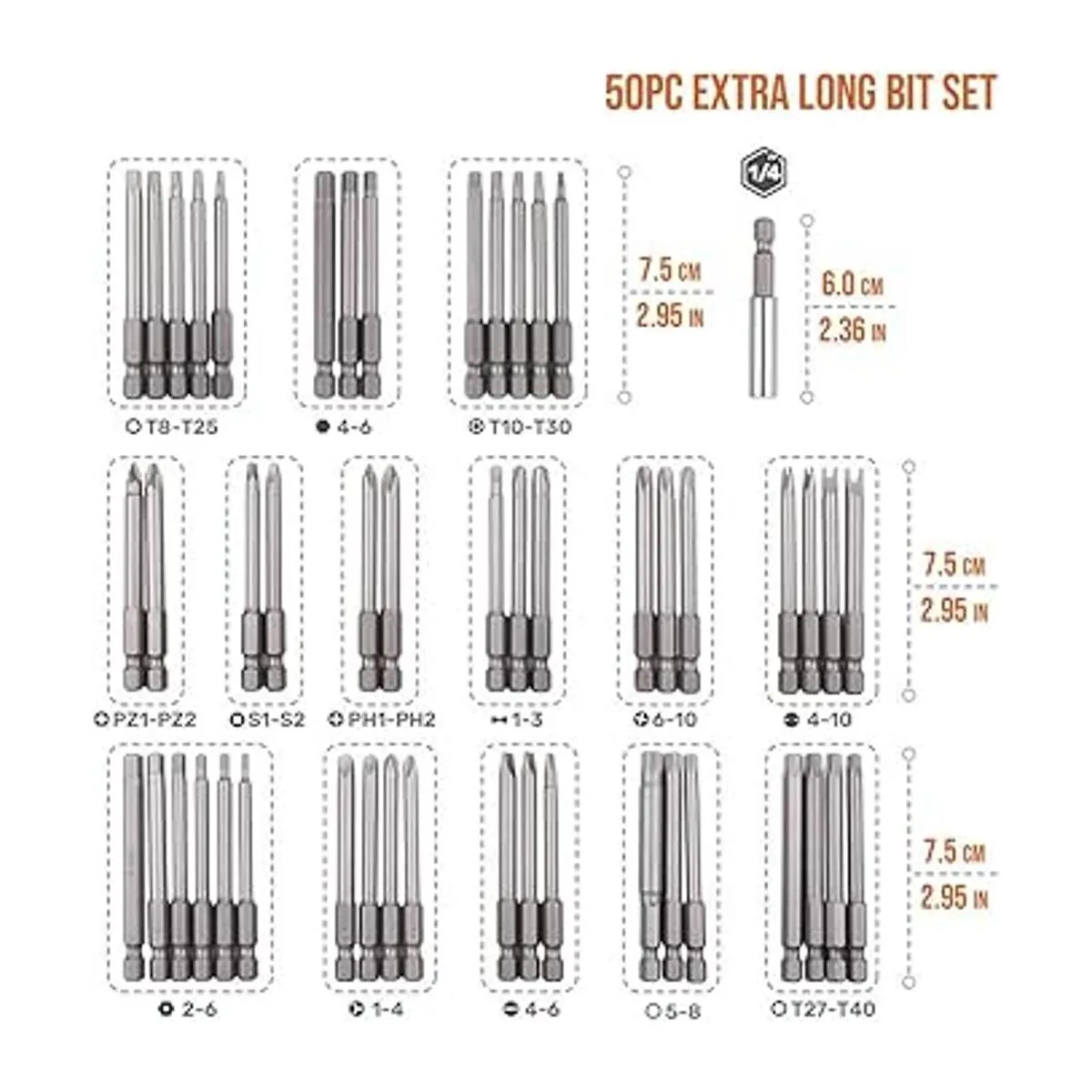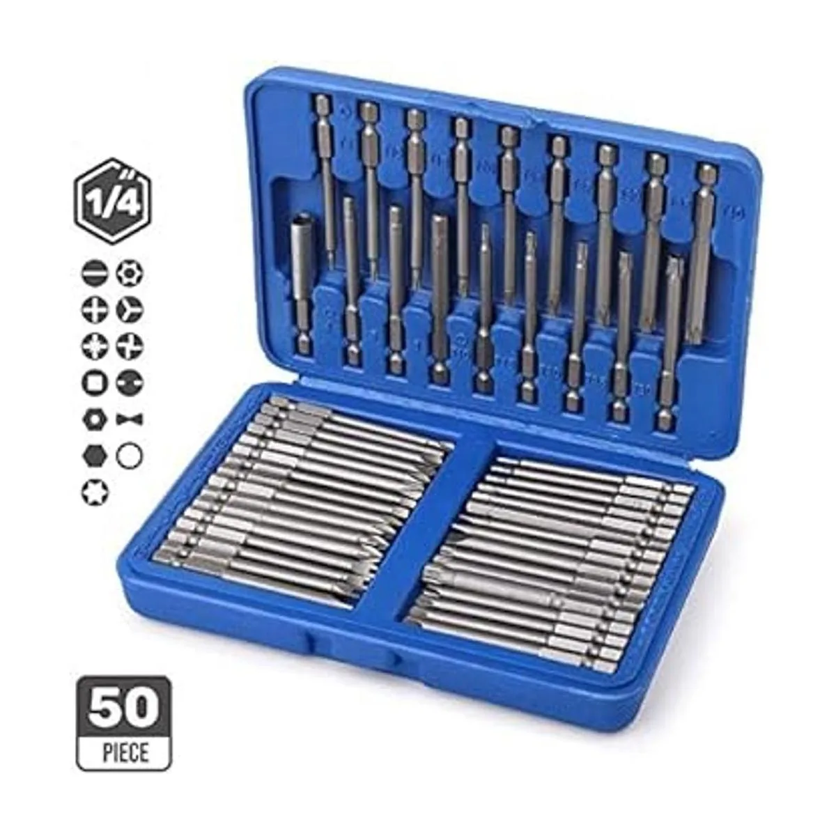 Rocaris Juego de 50 puntas de destornillador, juego de brocas de seguridad de 3 pulgadas, kit de destornillador magnético extra largo con funda, hexagonal, puntas de estrella, Philips, cuadradas, puntas de llave S2