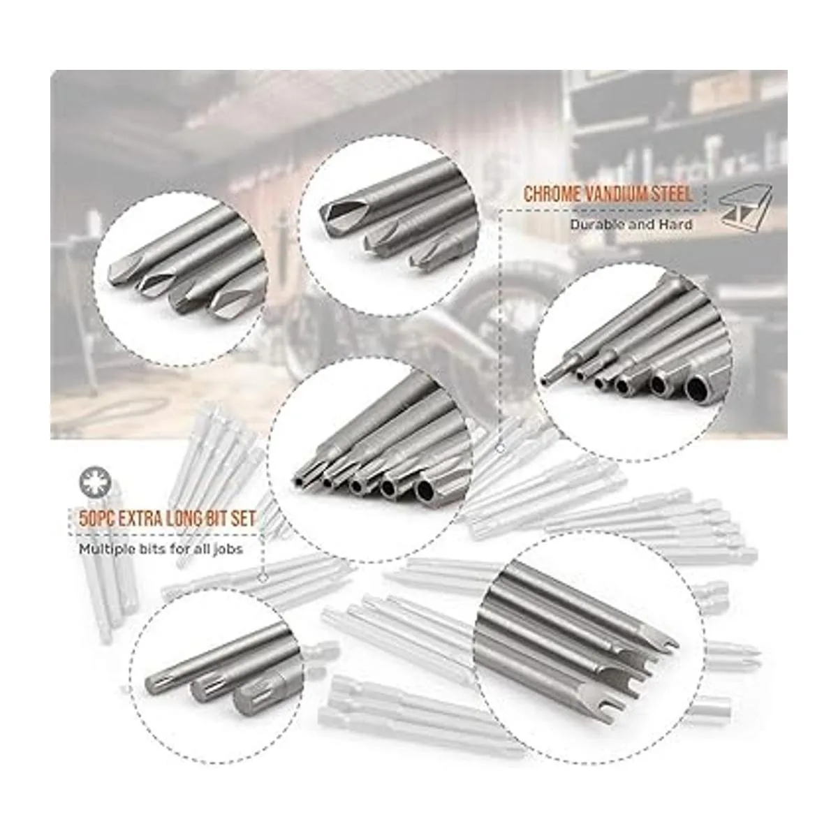 Juego de 50 brocas múltiples: estrella, estrella TP, embrague, torque, ranura, TriWing, cuadrado, llave, plano, Phillips, Pozidriv, puntas hexagonales y puntas hexagonales TP en una variedad de tamaños