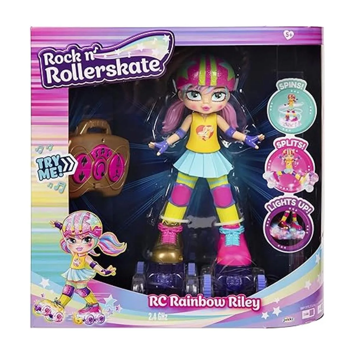 Rock N Rollerskate Muñeca Rainbow Riley Muñeca de patinaje con control remoto iluminado Reproduce música y patines, 10 pulgadas de alto