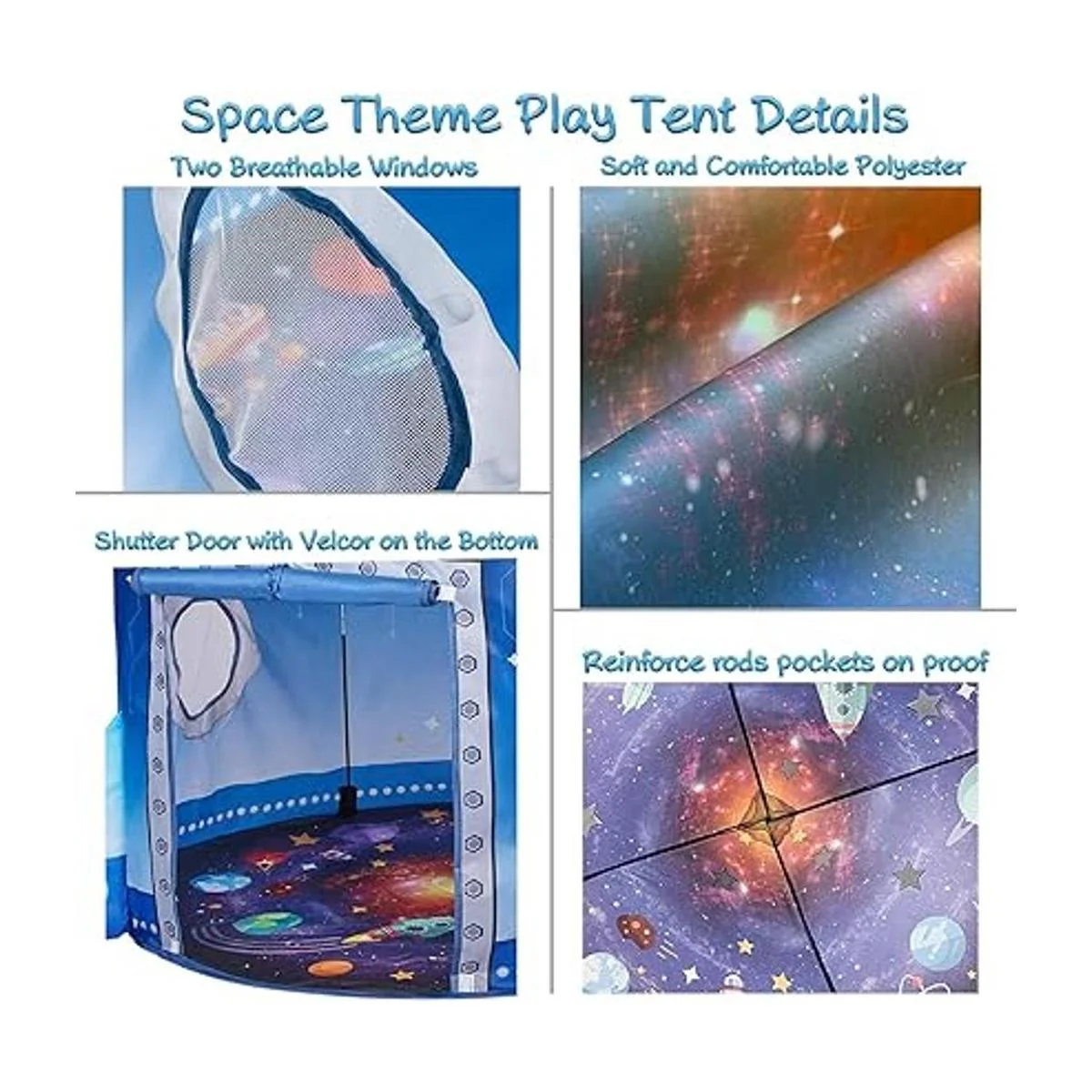 Tienda de campaña con temática espacial para niños: está especialmente diseñada para los pequeños exploradores. Planetas rotativos, estrellas brillantes, astronauta, nave espacial, cohetes… están impresos claramente en él. Y cada tienda de campaña interior tiene una puerta de cabina frontal enrollable, dos pequeñas ventanas de buey y dos pequeños soportes de transporte en la parte delantera. Todo hace que tus hijos imaginen ser un astronauta en un mundo del universo. Sabes lo emocionado cuando ven estos juguetes espaciales creativos.