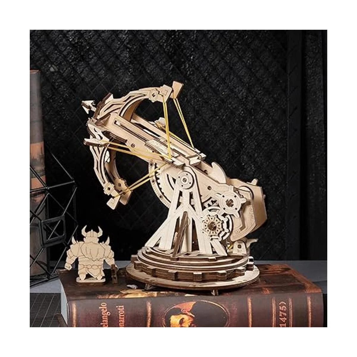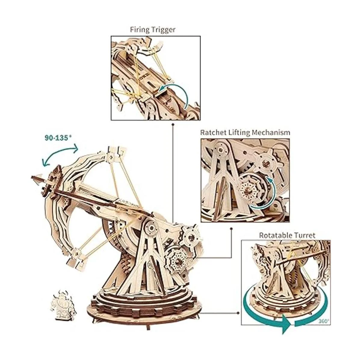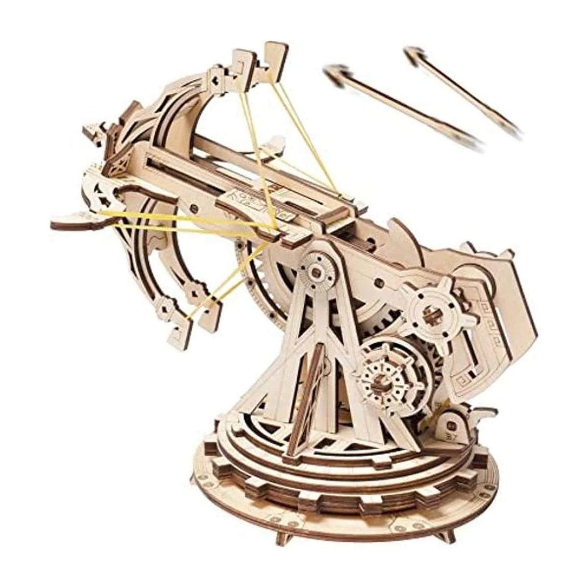 Dispositivos mecánicos: una vez construidos, el kit de modelo de madera puede lanzar proyectiles a 10 pies. Gira los engranajes de elevación para ajustar sus ángulos de lanzamiento entre 90 y 135. Tiene una torreta giratoria de 360 para que apuntes a cualquier lugar que desees.