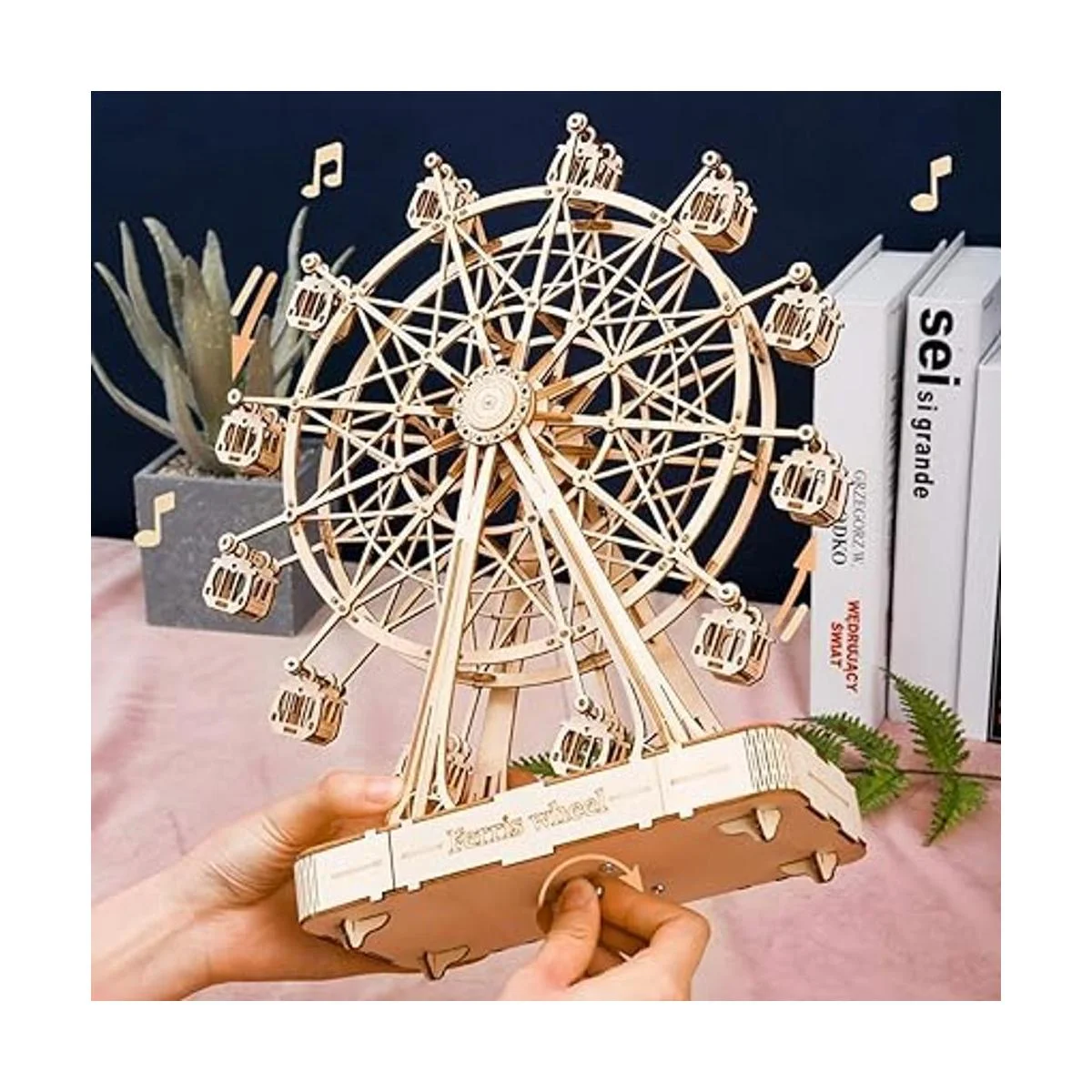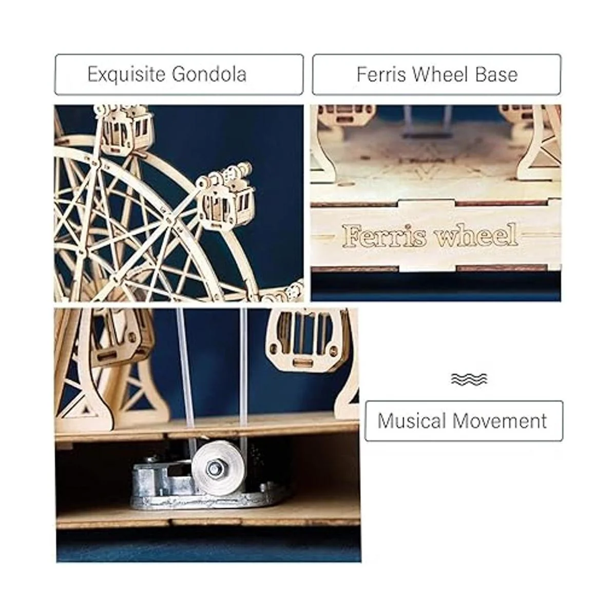 Caja de música con ruedas de gran ferris El kit de modelo de madera está equipado con movimiento de música, se enrolla girando el resorte inferior, suelta y la rueda va lentamente con la hermosa melodía, la combinación perfecta de belleza y música.