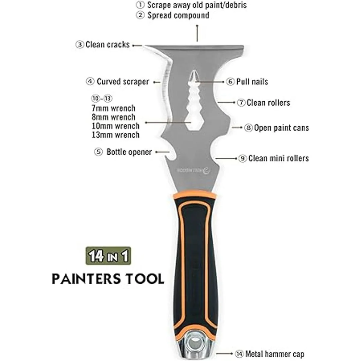 ROLLINGDOG Herramienta de pintor 14 en 1 de 3 pulgadas, raspador de pintura, cuchillo de masilla con hoja de acero inoxidable, mango de agarre suave y extremo de martillo de metal