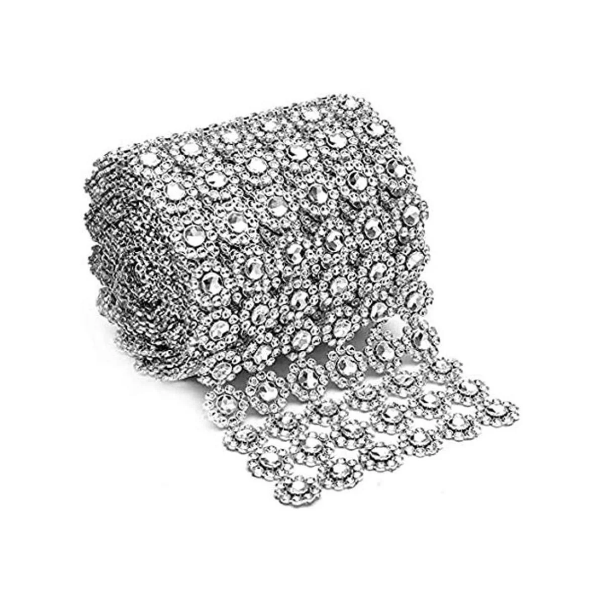 Rollo de malla con forma de flor de diamante de plata, cinta de cristal de diamantes de imitación, 4 x 1 yarda