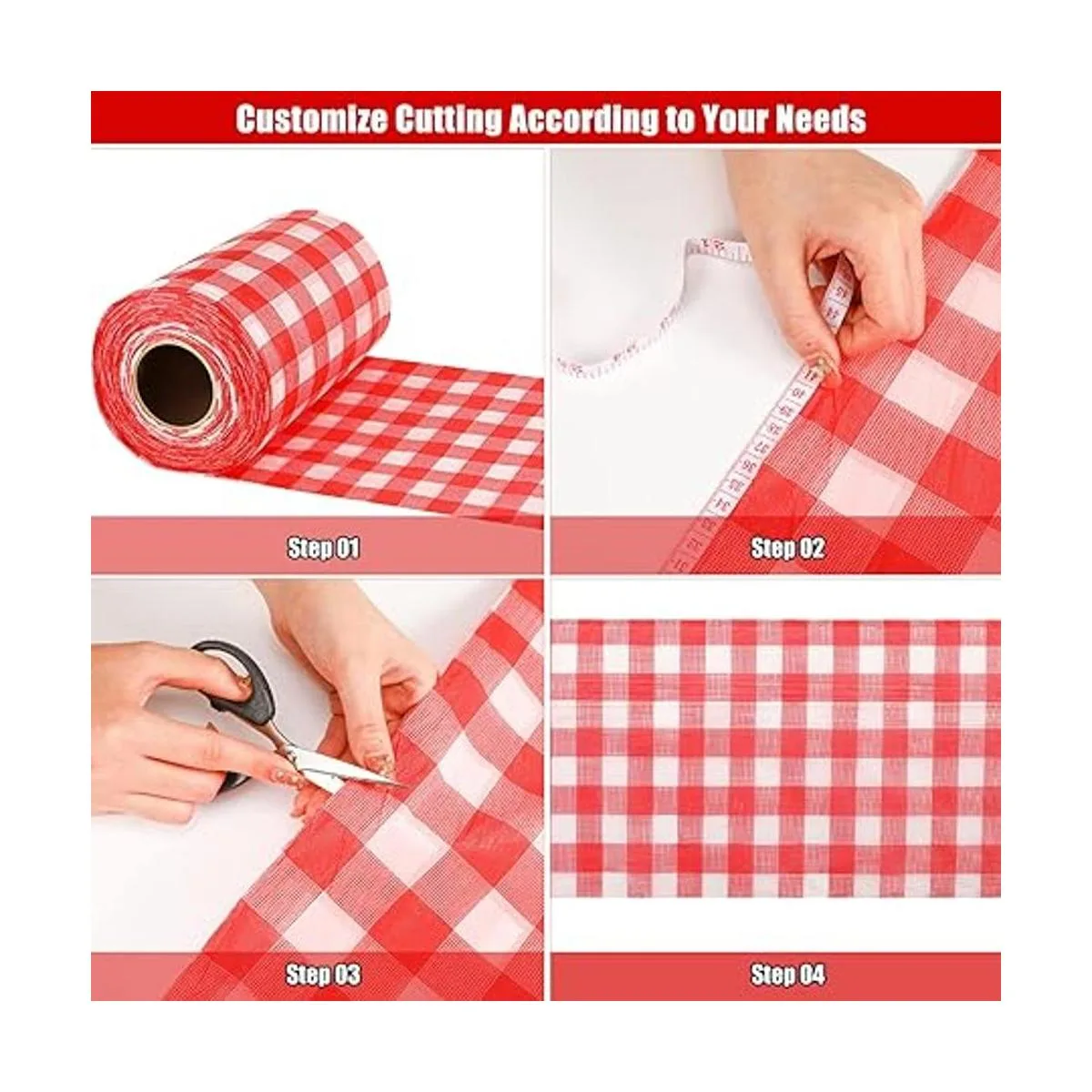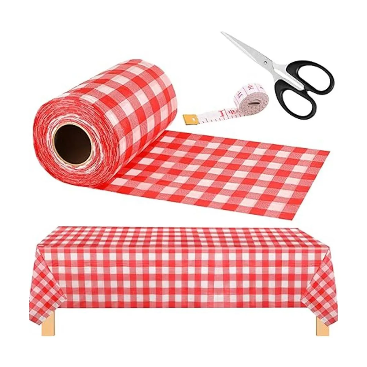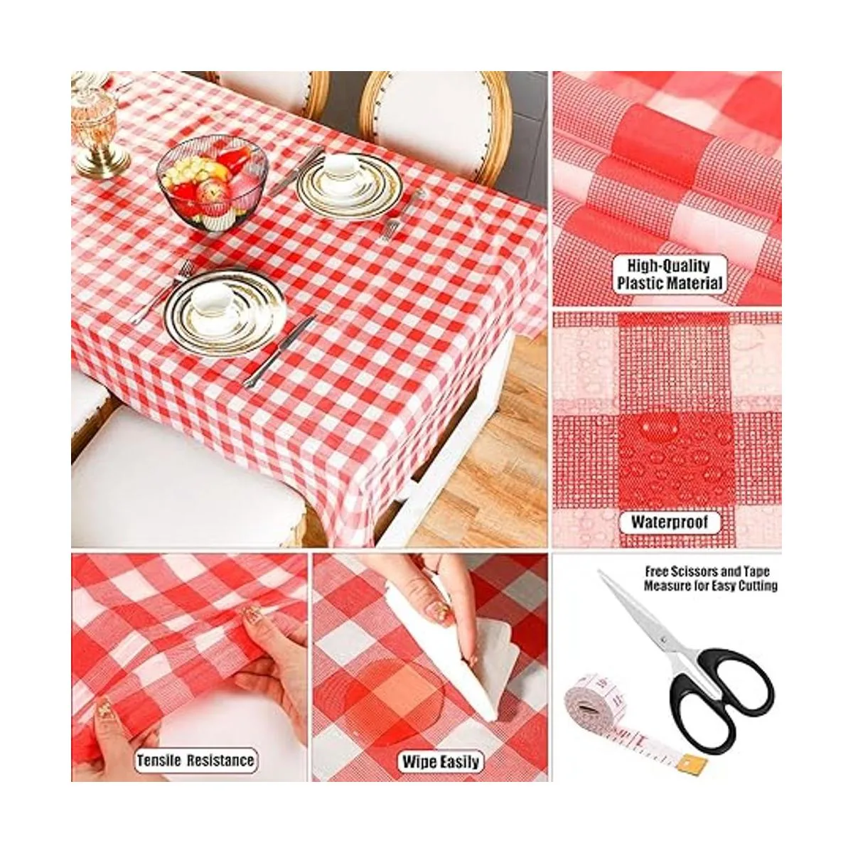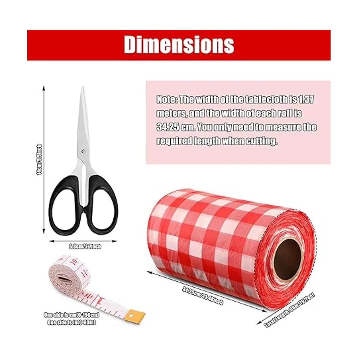 Rollo de mantel de plástico desechable de 54 x 197 pies, impermeable, de plástico a cuadros con tijeras y cinta métrica para exteriores, pícnic, banquete, cumpleaños, boda color rojoblanco
