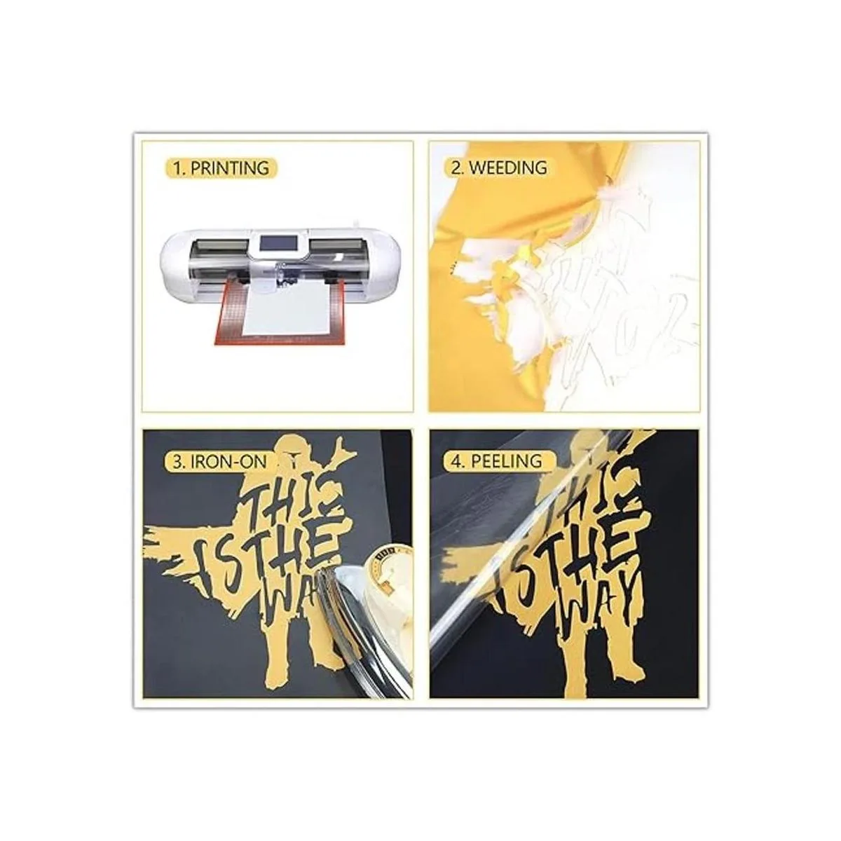Cómo utilizar el vinilo de poliuretano HTV 1. Crea tu diseño en el ordenador. 2. Retira la película protectora azul. 3. Corta con el lado brillante hacia abajo y la parte posterior más opaca del vinilo HTV hacia arriba. 4. Elimina el exceso de vinilo, dejando tu diseño en la hoja de transferencia. 4. Aplica el diseño a tu camiseta con prensa de calor a 302330F durante 515 segundos. Se recomienda temperatura 302 durante 10 segundos o 330 durante 5 segundos si utilizas una plancha casera, añade más tiempo y aumenta la presión. 5. Despegar en caliente si las zonas de diseño se levantan después de la aplicación.