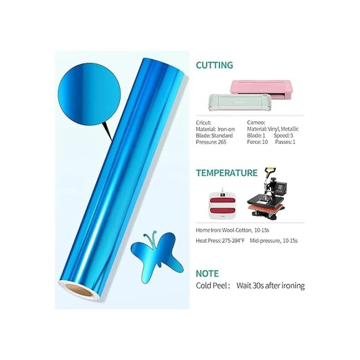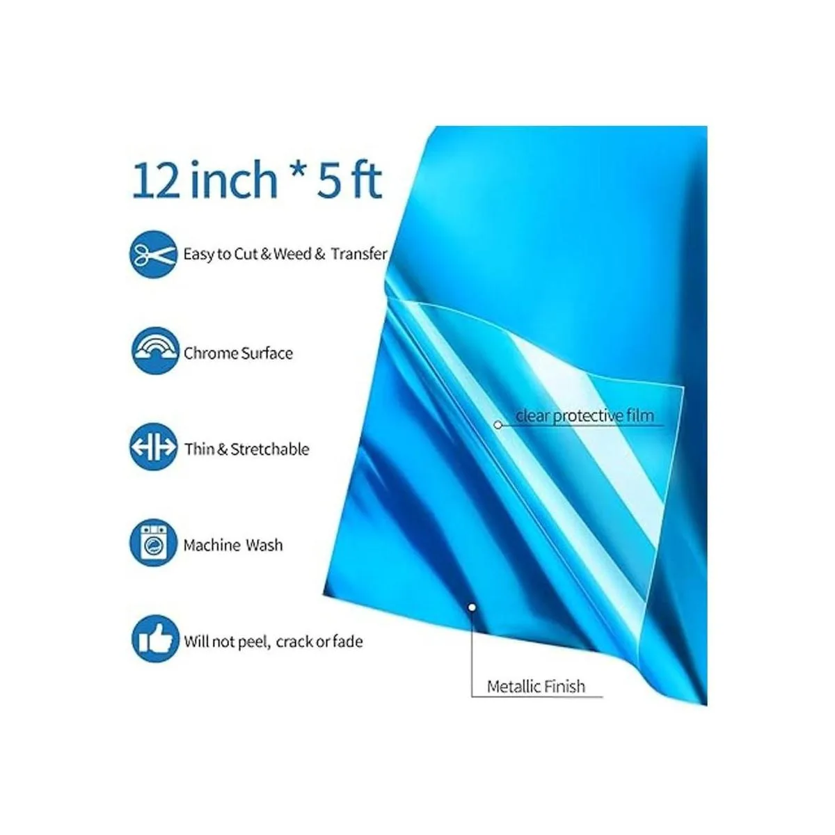 Rollo de vinilo HTV metálico de 12 x 5 pies, vinilo de transferencia de calor azul, vinilo cromado para planchar, fácil de cortar y desmalezar, diseño de prensa de calor para camisetas