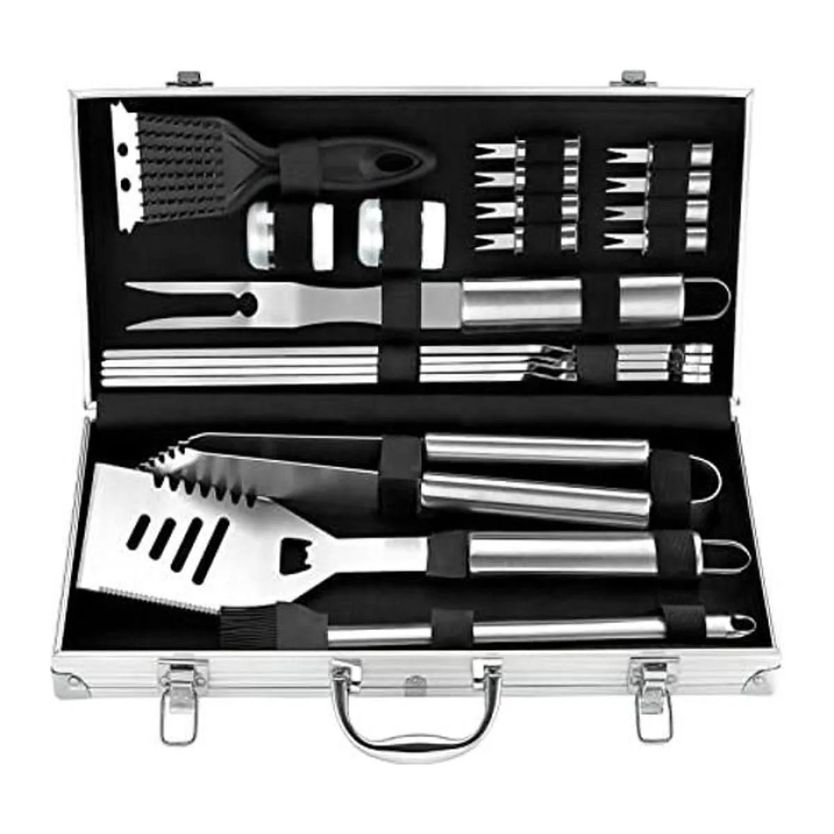 Kit completo de accesorios para parrilla: espátula, tenedor, pinzas, cepillo para hilvanar, cepillo para parrilla, salero y pimienta, 8 soportes para maíz, 4 pinchos, caja de aluminio.