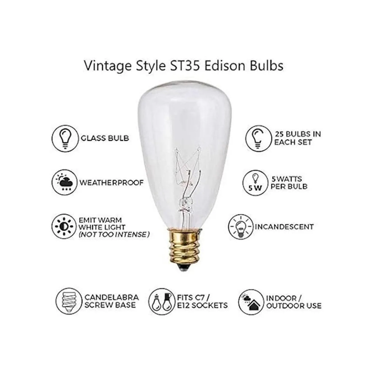 Romasaty Paquete de 25 bombillas ST35 de repuesto Edison transparentes, 5 vatios, base de tornillo C7E12 para interiores y exteriores