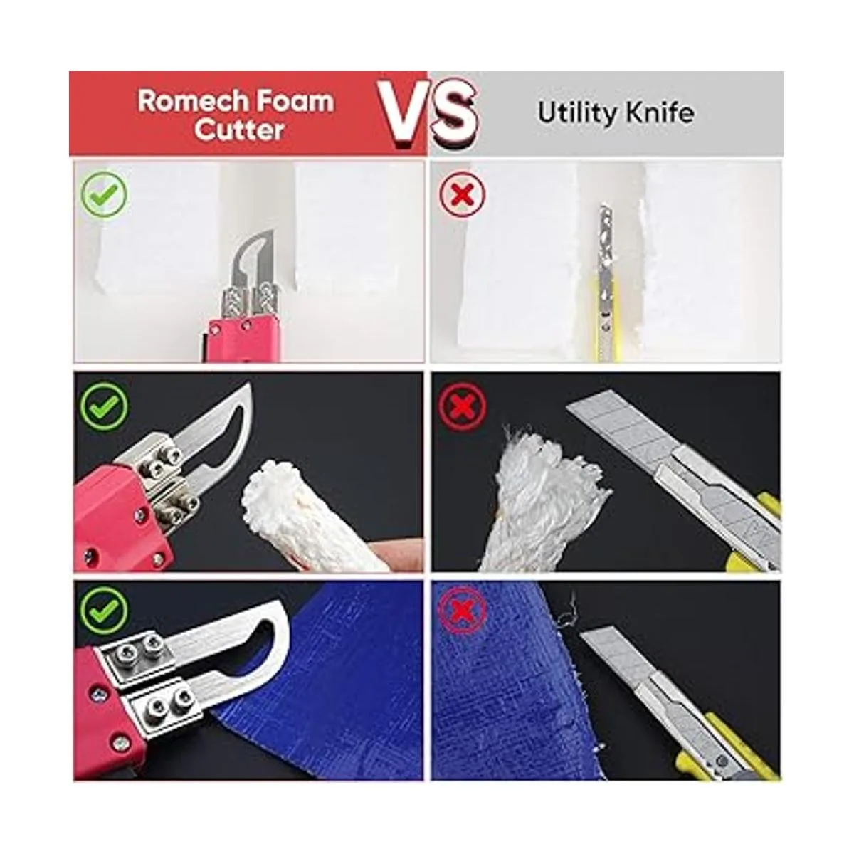 Corte limpio y suave, sin ensuciar: los cuchillos calientes RoMech cortan la tela, la cuerda y la espuma de poliestireno suaves y rápidos como la mantequilla, sellan los bordes limpios y no dejan residuos. Puedes cortar la tabla de espuma o el bloque de espuma desde cualquier ángulo y hacer manualidades en la forma deseada