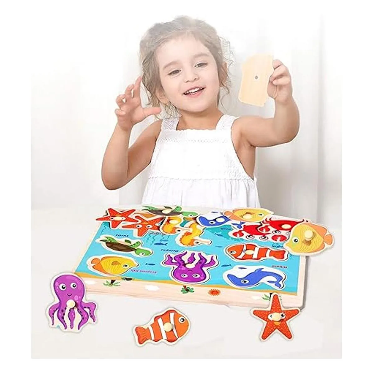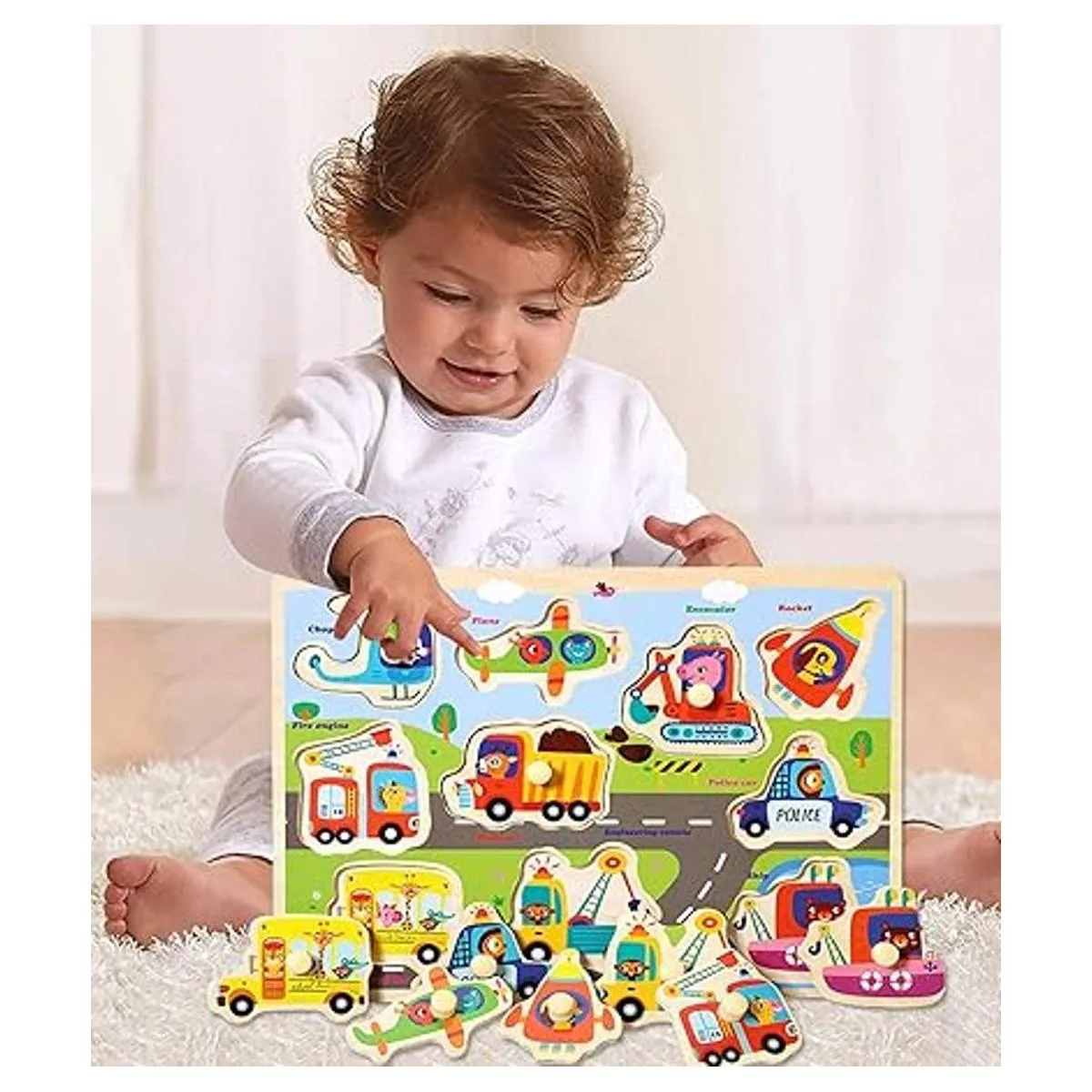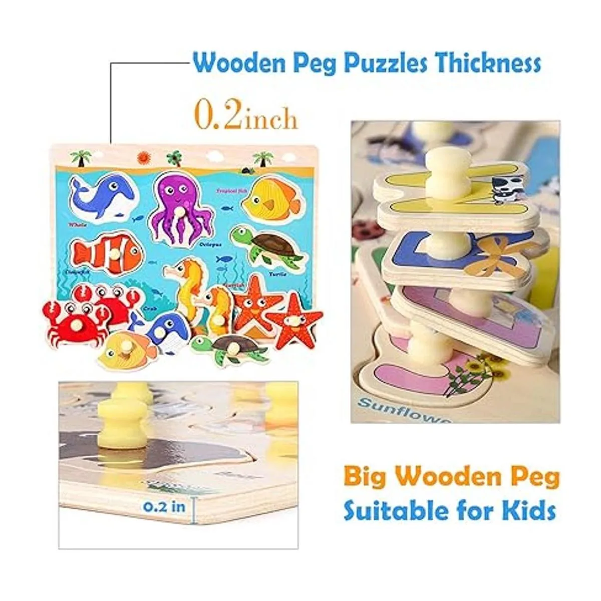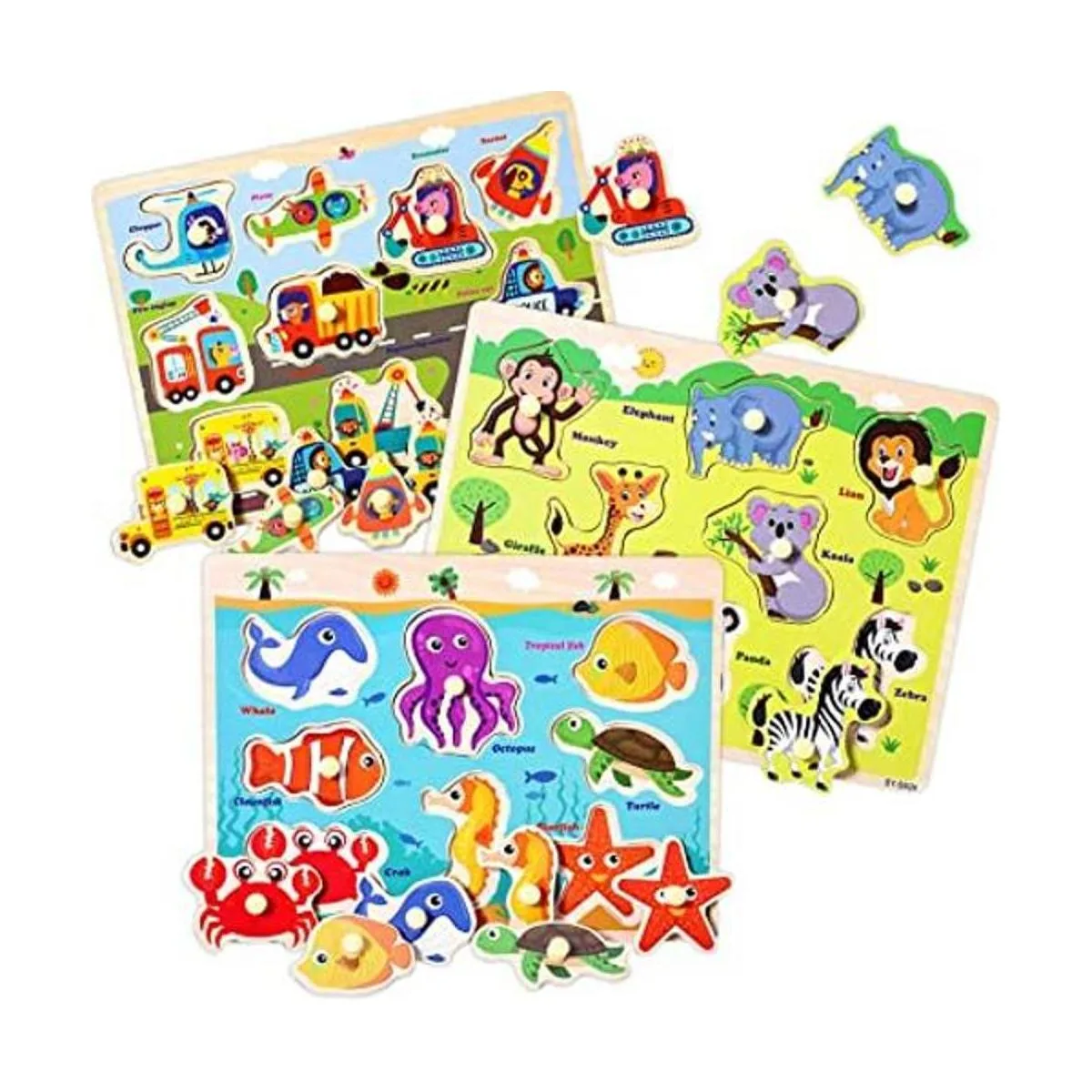 Rompecabezas de clavijas de madera para niños pequeños de 2, 3, 4 años, juguete educativo de clavijas preescolares, juego de rompecabezas de 3 piezas para niños pequeños, tráfico, animales y océano, gran regalo para niñas y niños