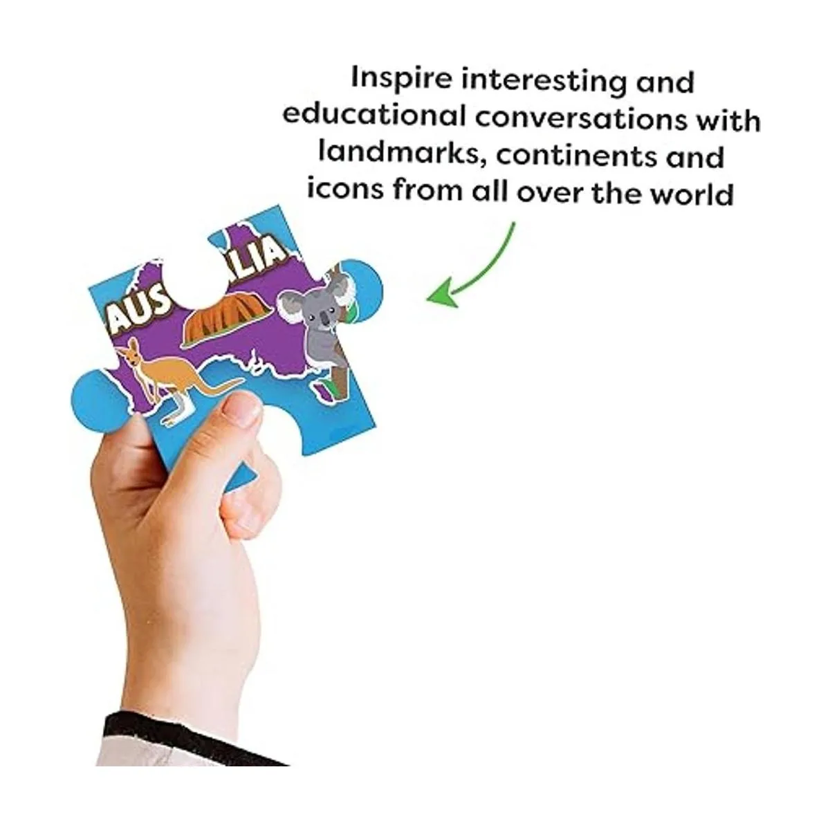75 piezas de rompecabezas fáciles de montar con una dimensión total de 23.6 x 17.3 in cuando se coloca. Muestra interesantes monumentos, continentes e iconos en diferentes lugares. Aumenta la conciencia de la geografía de tu hijo, despierta conversaciones educativas sobre el mundo e inspira su imaginación