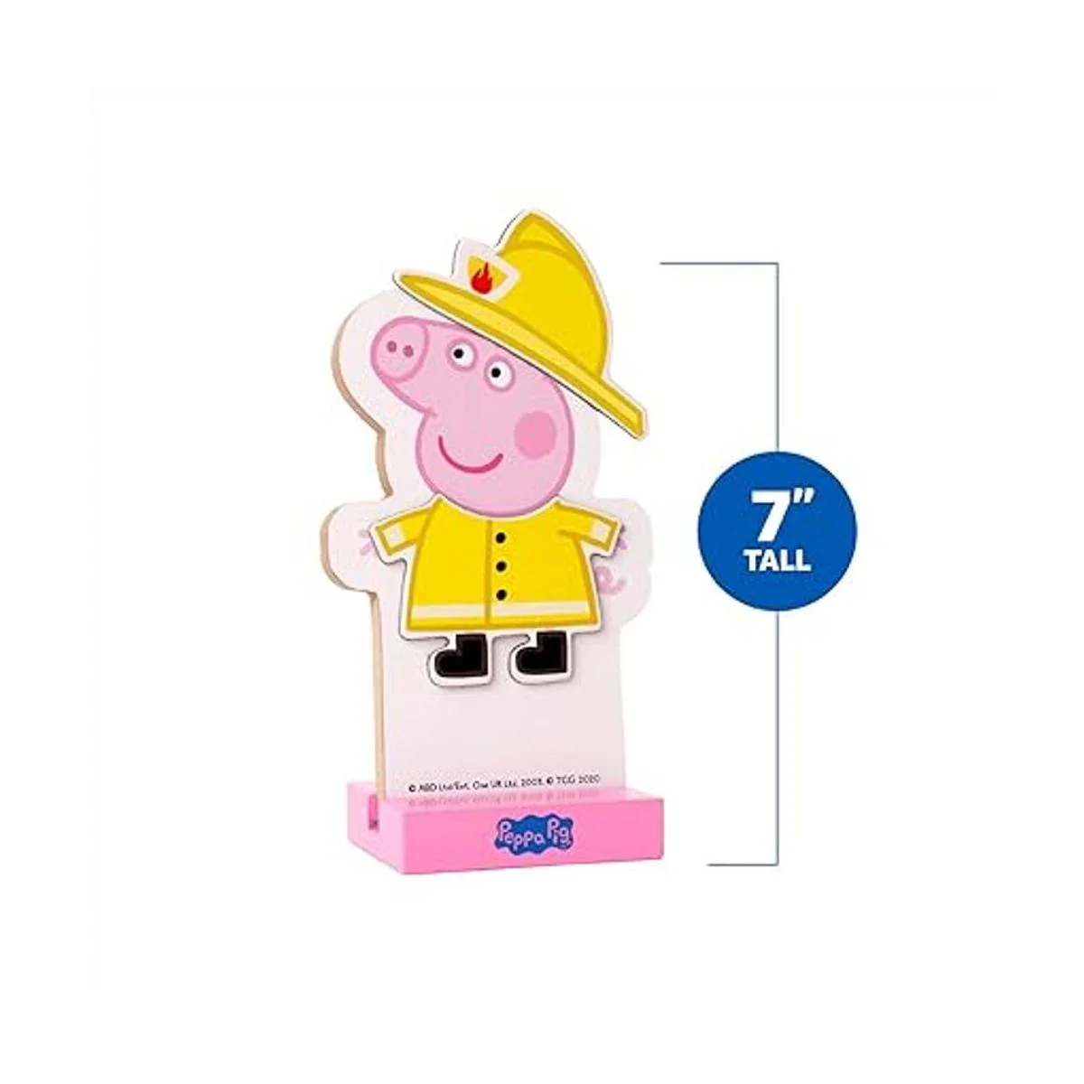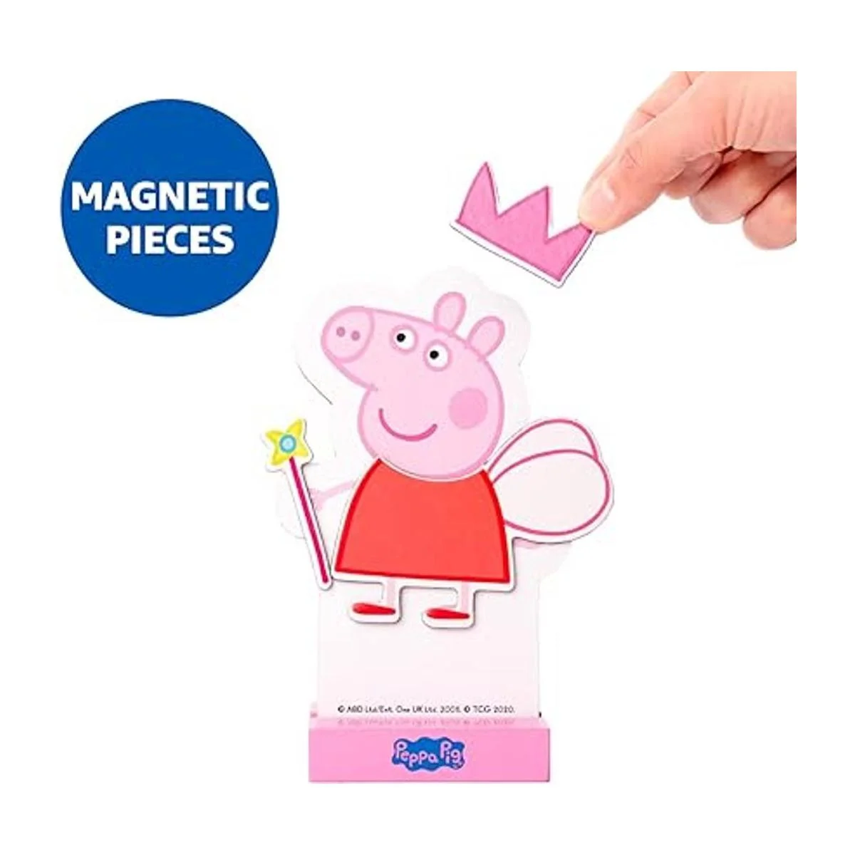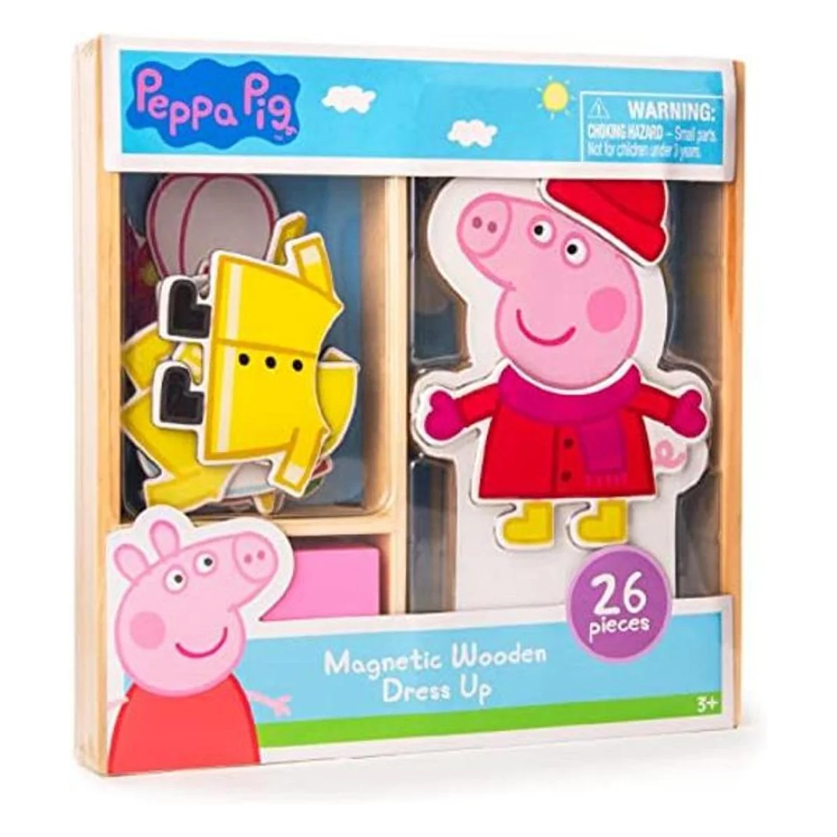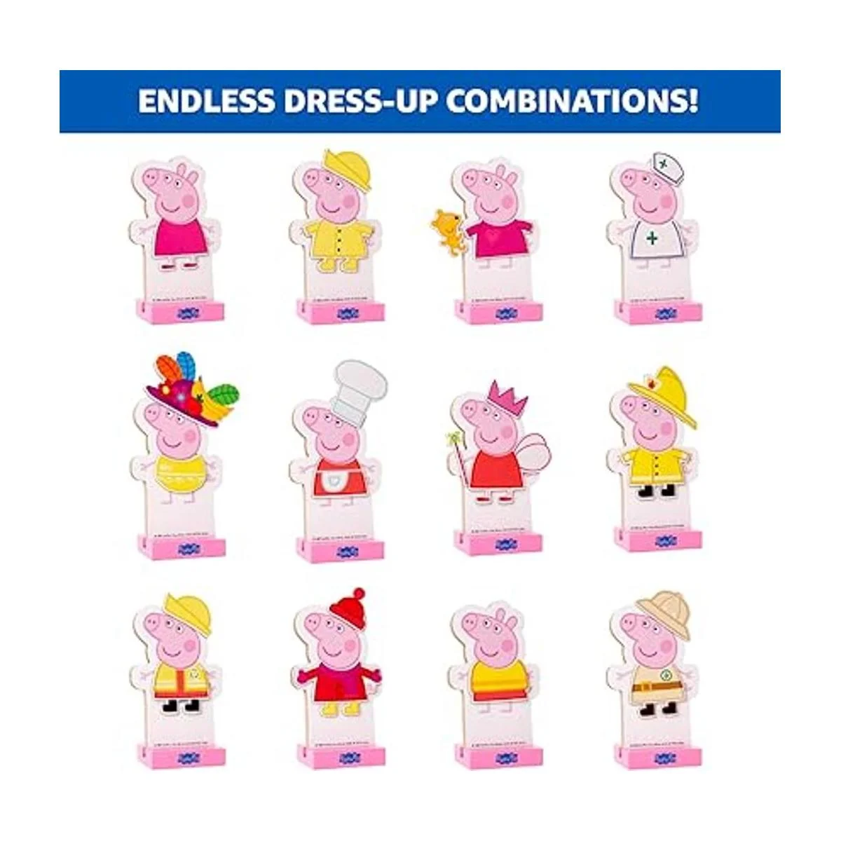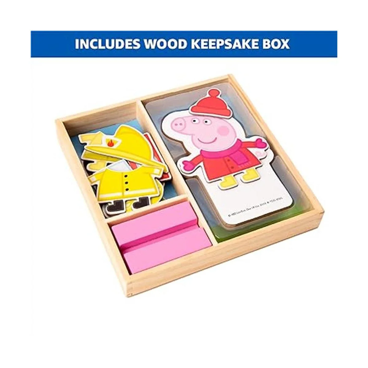 Vestido de Peppa Pig en divertidos trajes para cualquier ocasión con este vestido de madera magnética Up Kit. características Chunky, fácil de agarre piezas, escenas de madera magnética y una caja de almacenamiento de madera para una fácil limpieza
