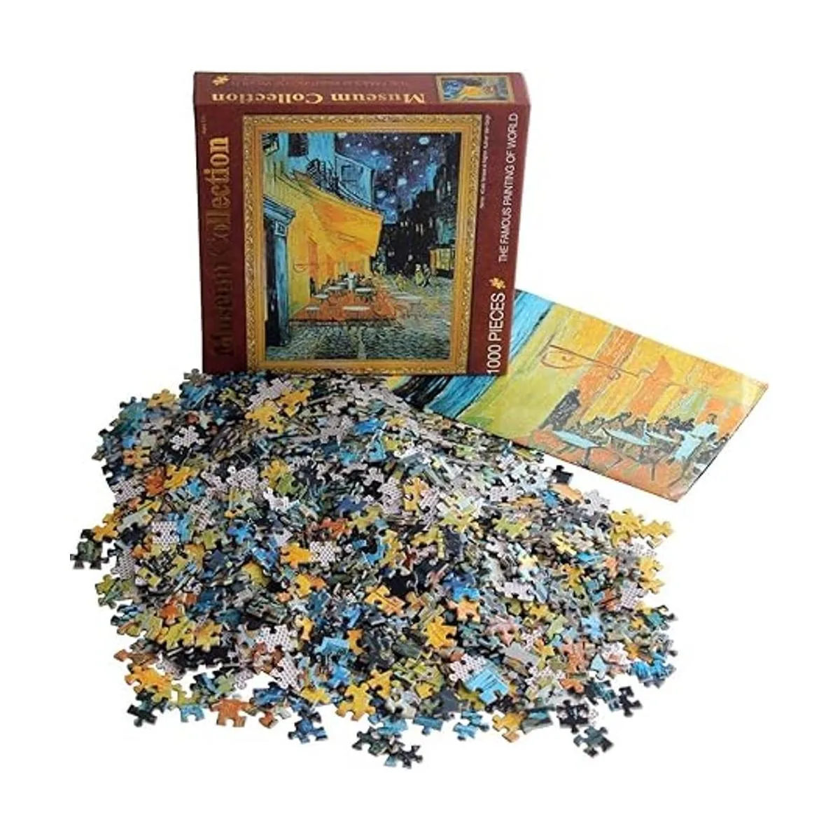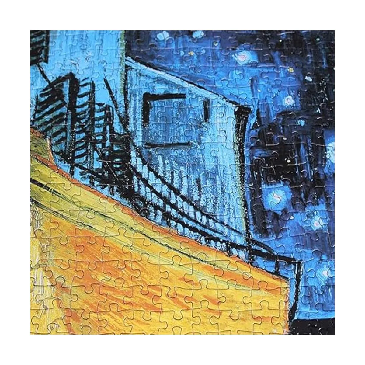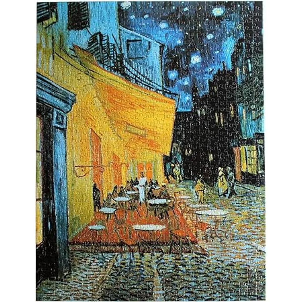 Rompecabezas de arte famoso: la imagen en el rompecabezas es la obra de arte de Vincent Van Gogh Cafe Terrace at Night. Tamaño terminado: 27.56 x 19.69 pulgadas.