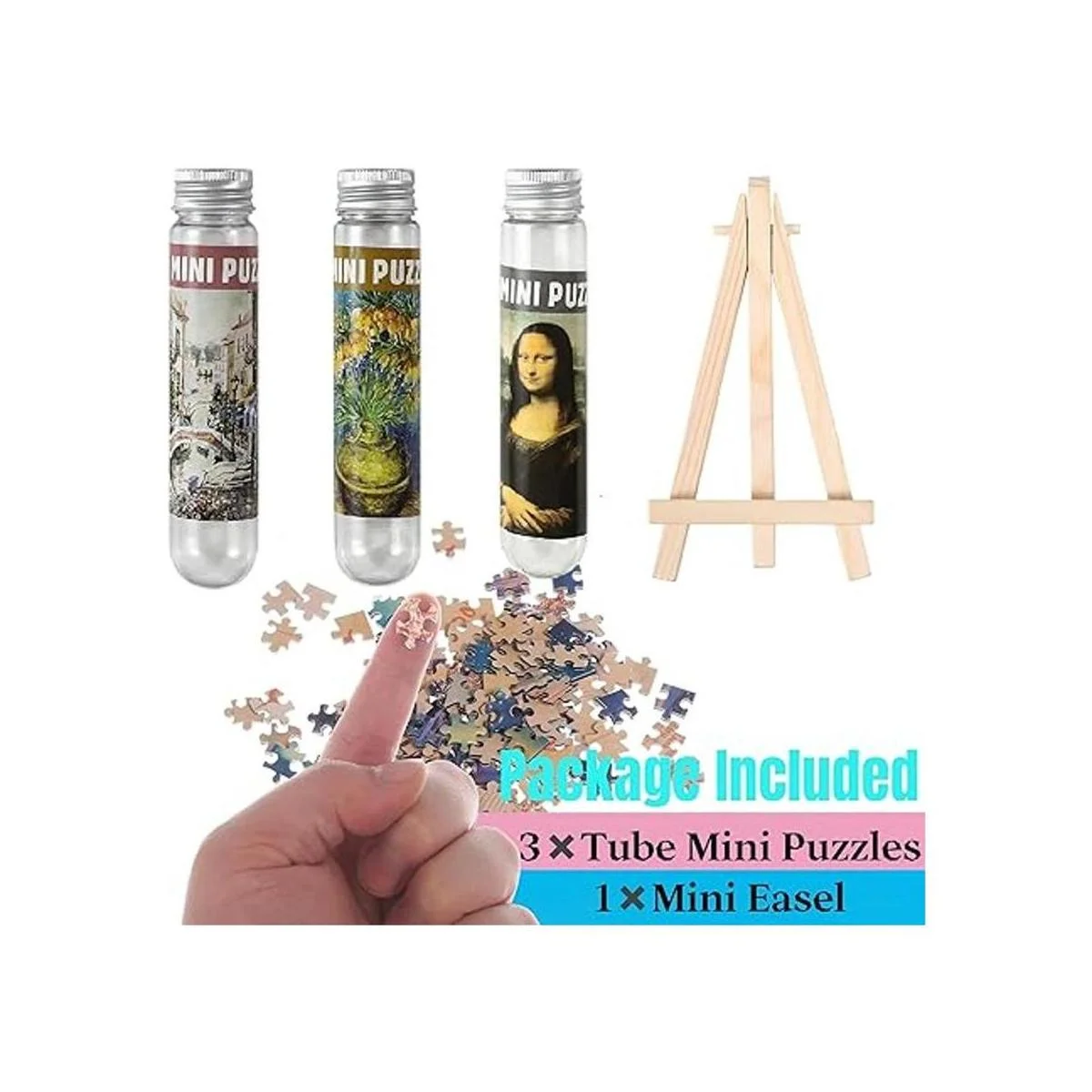 El paquete incluye: 3 paquetes de rompecabezas, 1 mini caballete y 1 juego de rompecabezas.