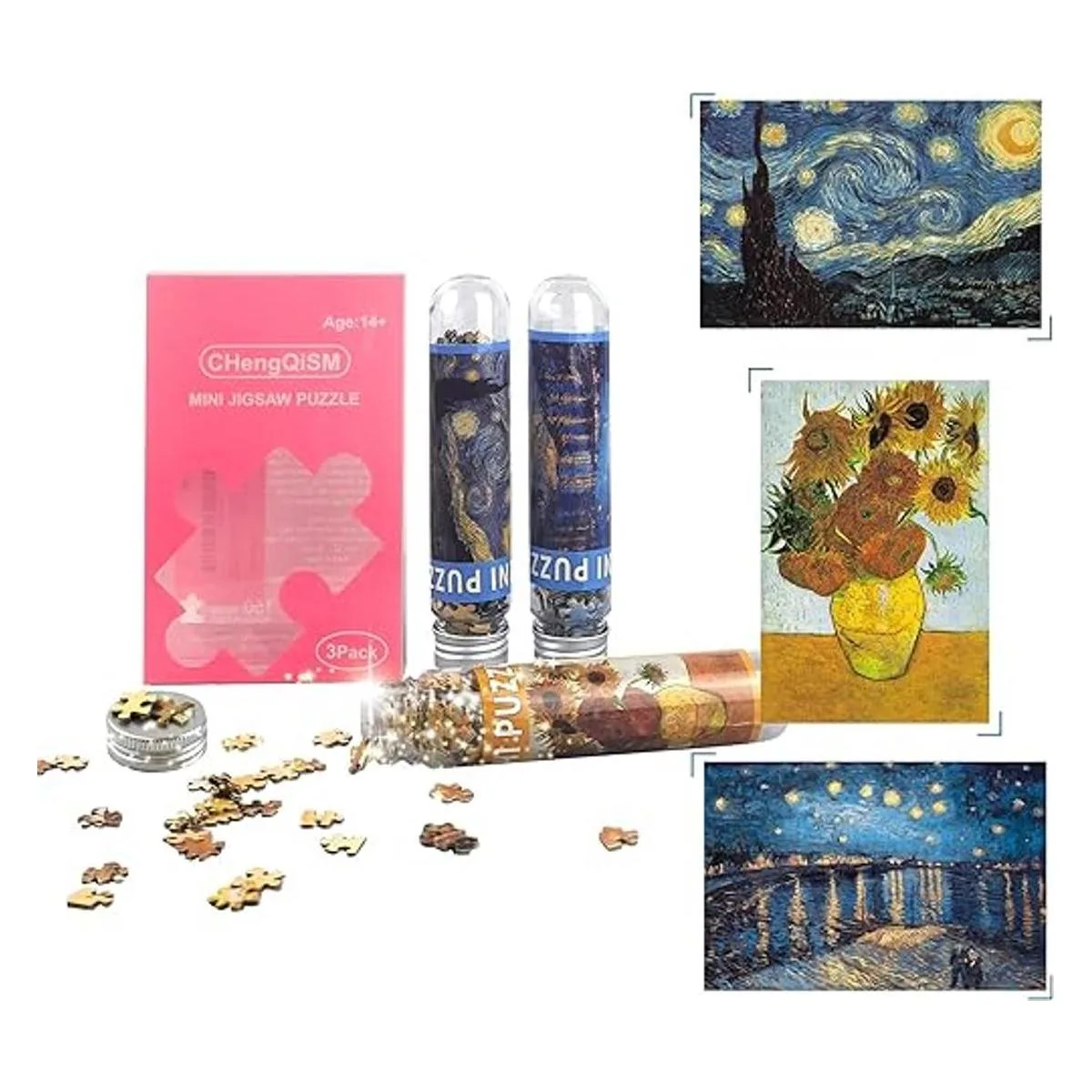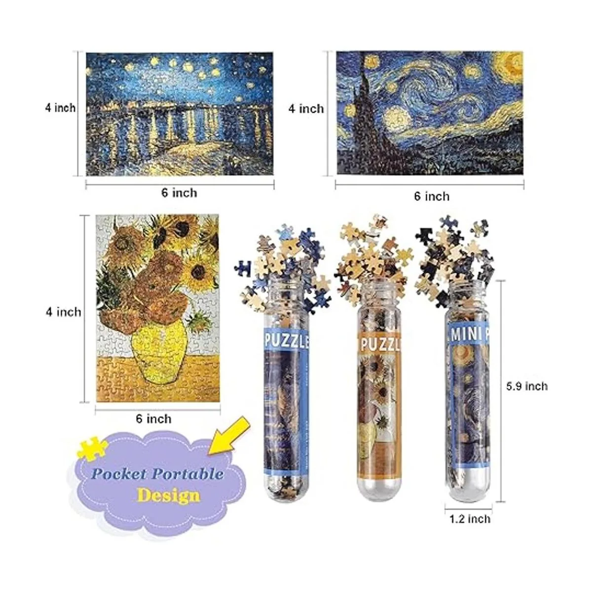 Rompecabezas pequeños para adultos, mini rompecabezas desafiantes y difíciles, noche estrellada, río, girasol, 150 piezas, decoración del hogar, entretenimiento de 6 x 4 pulgadas, paquete de 3
