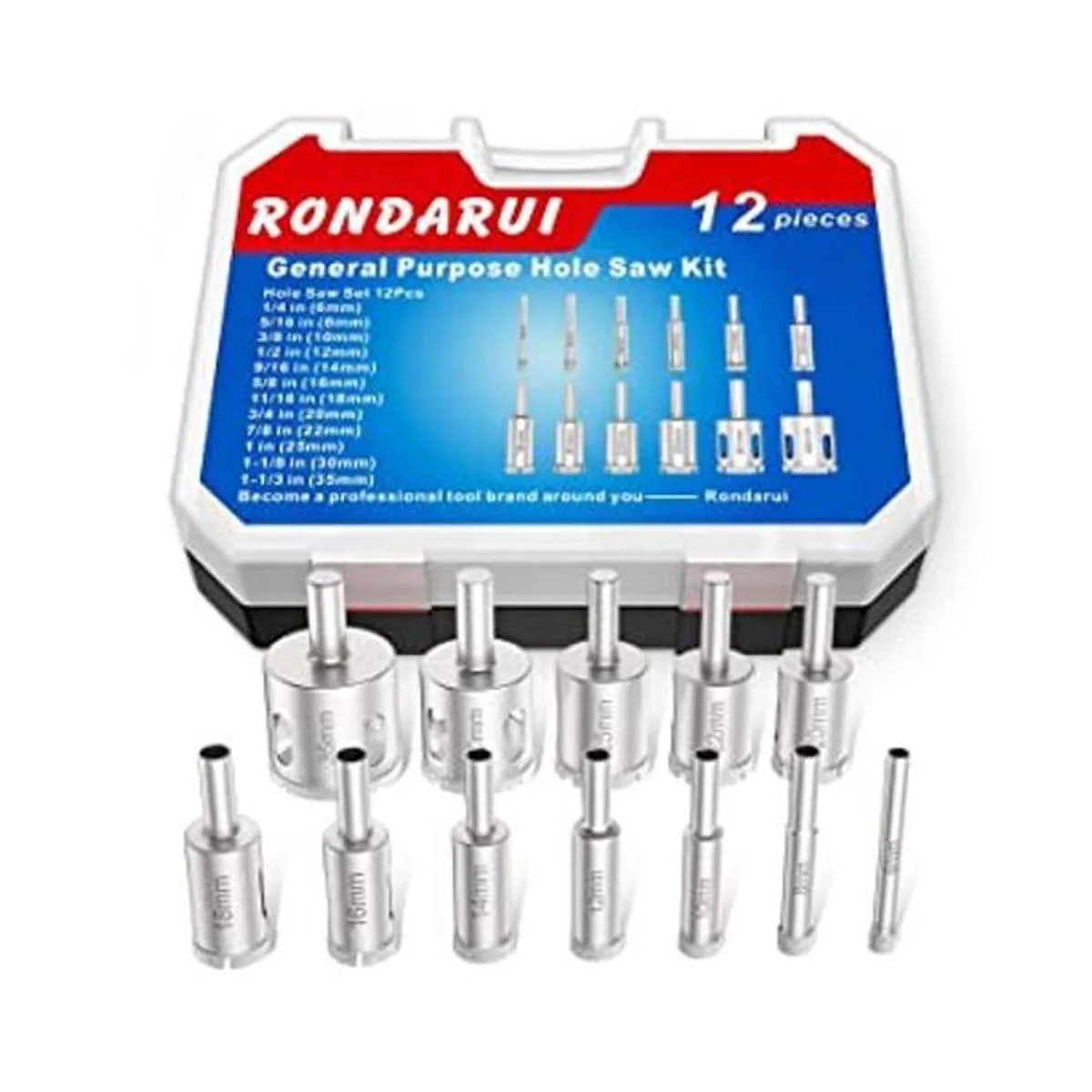 Contenido del paquete: una bonita caja de plástico duro y 12 sierras perforadoras de diferentes tamaños: 0.236 in, 0.315 in, 0.394 in, 0.472 in, 0.551 in, 0.630 in, 0.709 in, 3/4 pulgadas 0.787 in, 7/4 pulgadas 0.787 in 8.0 in 7.953 in, 0.984 in, 1.181 in, 1.378 in.