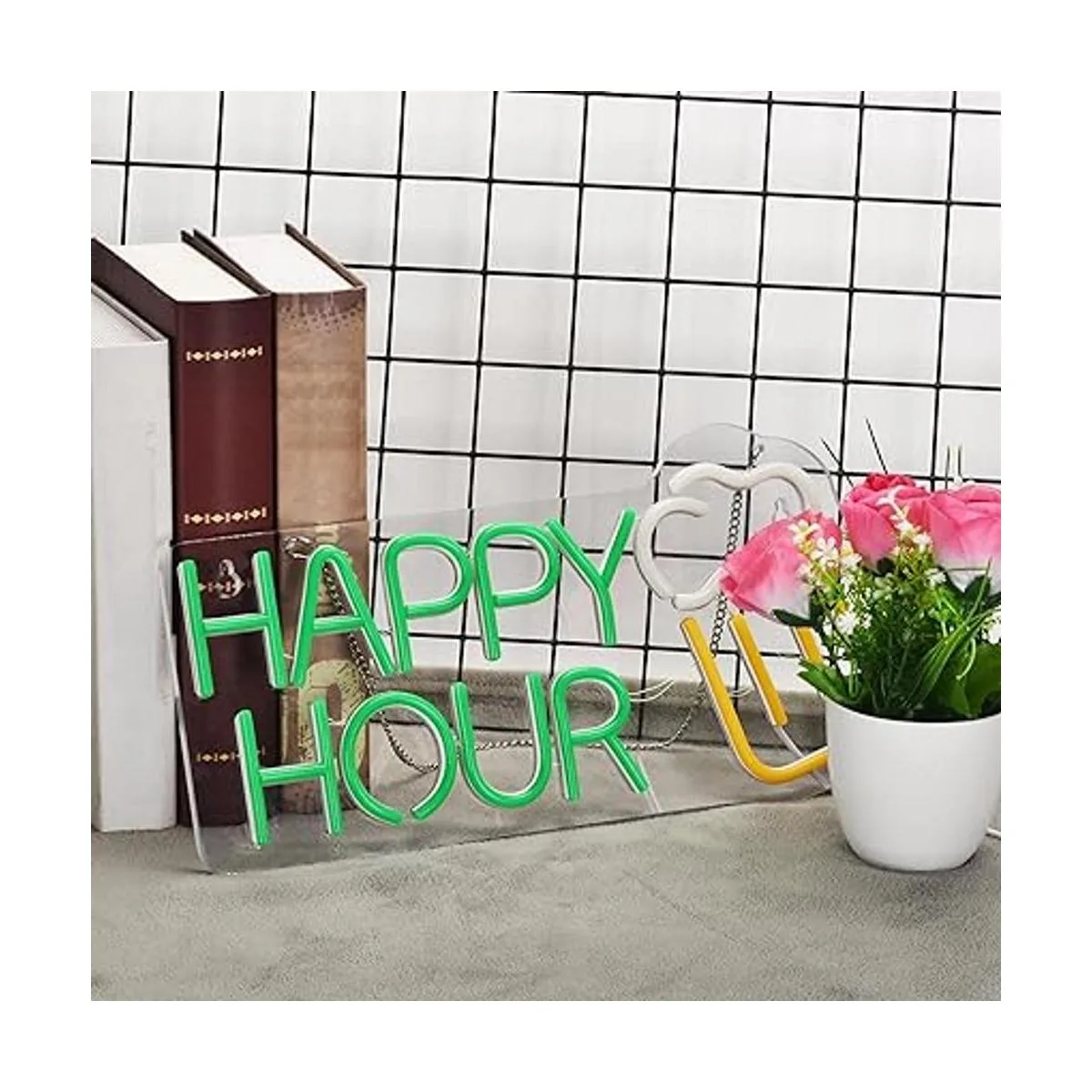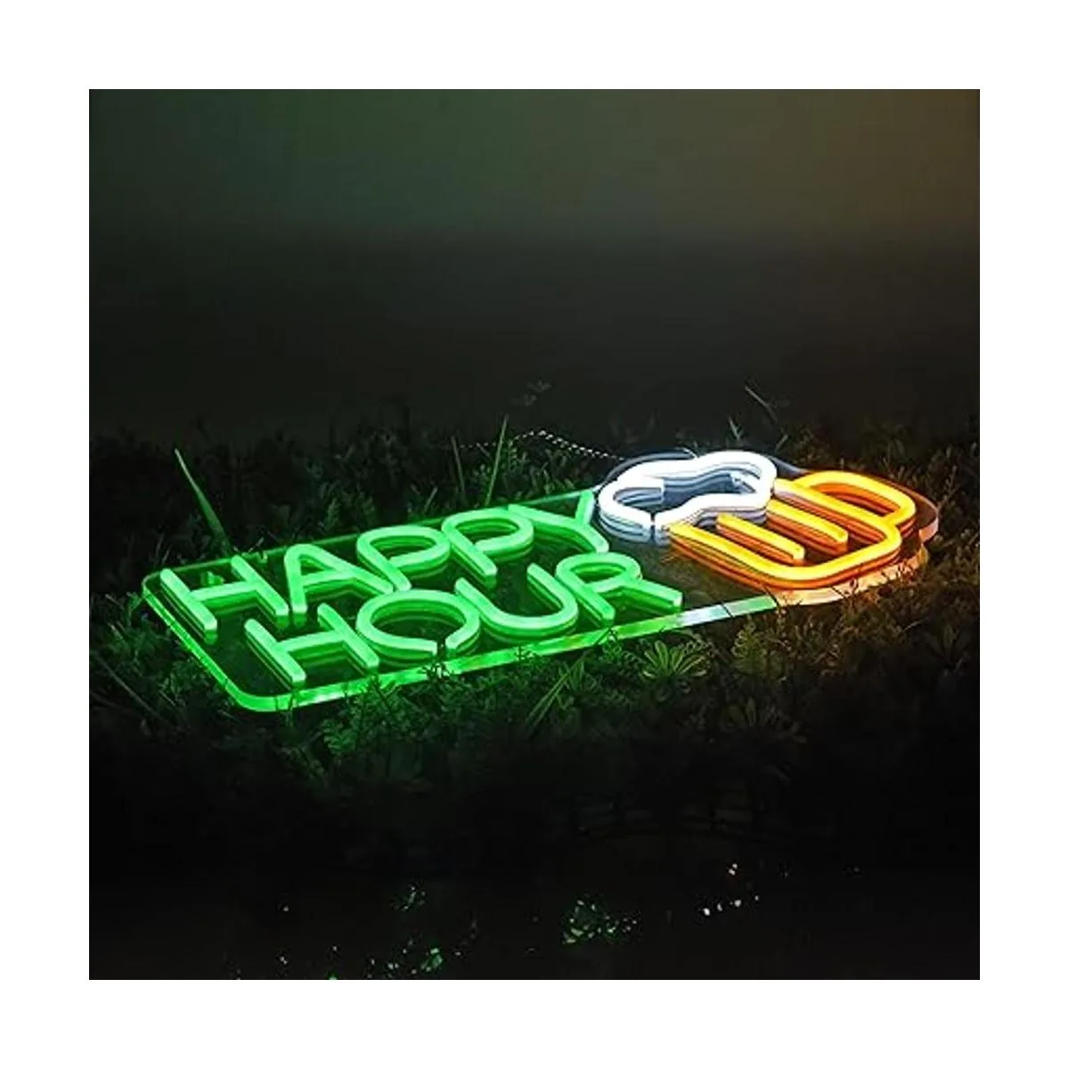 Letrero de neón Happy Hour, hecho de tiras de luces LED de silicona flexible y fijado en un tablero acrílico transparente.