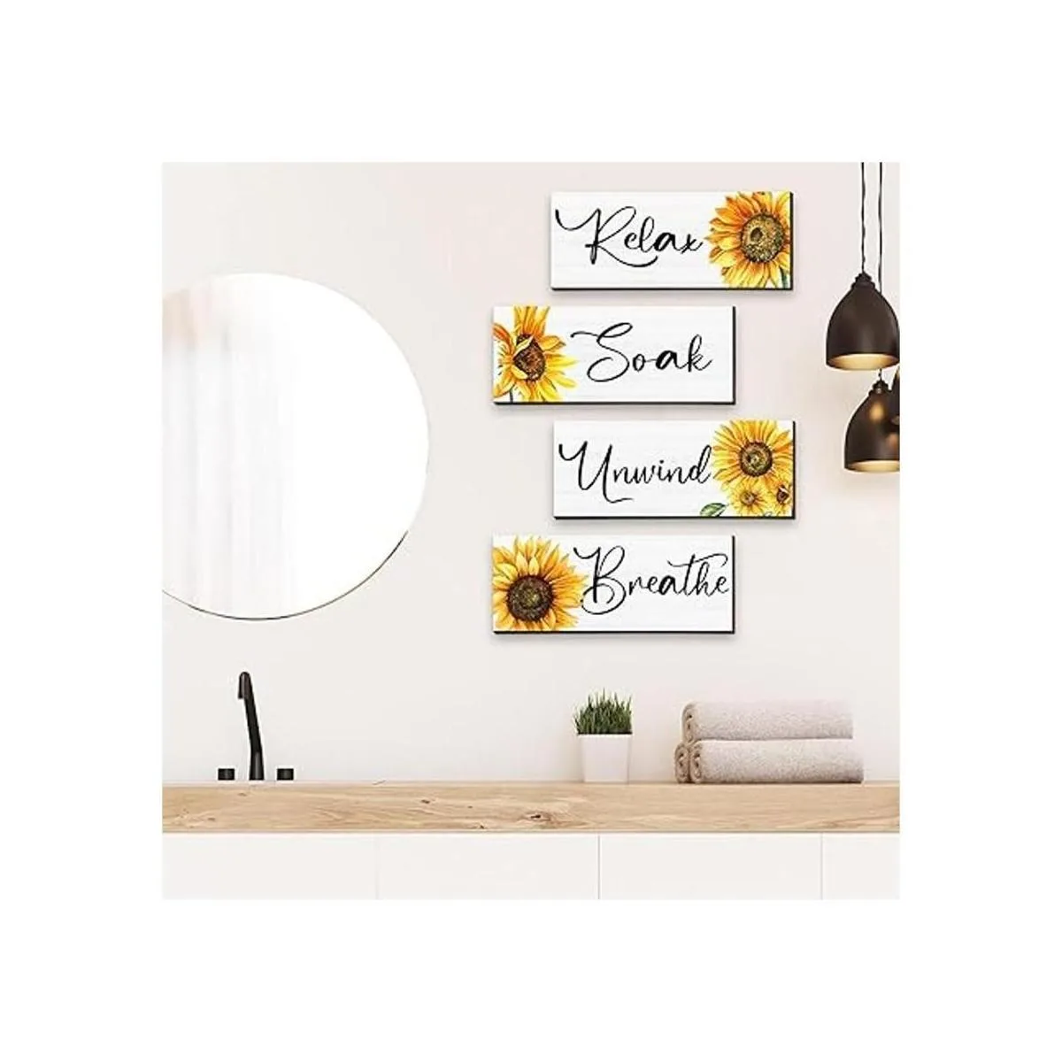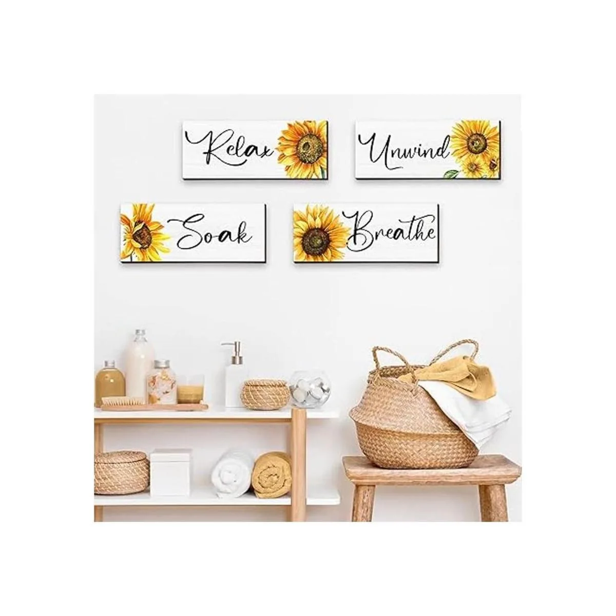 Hermosa y llamativa: estas decoraciones de madera rústica para el baño están pintadas con patrones de girasoles, combinadas con diferentes palabras artísticas, son hermosas y llamativas, haciendo que tu hogar sea más rústico
