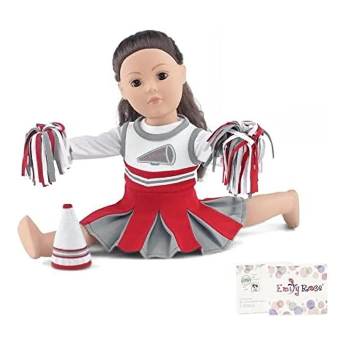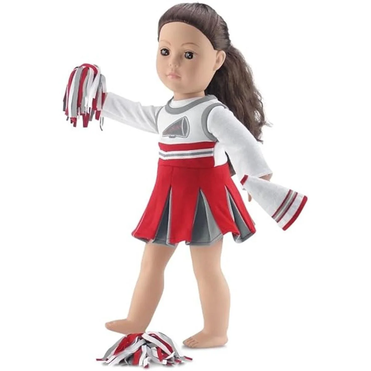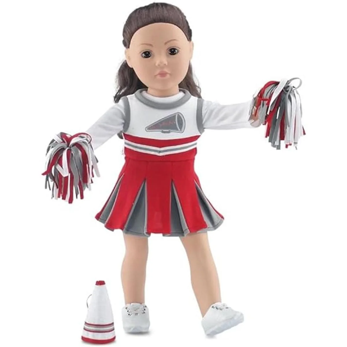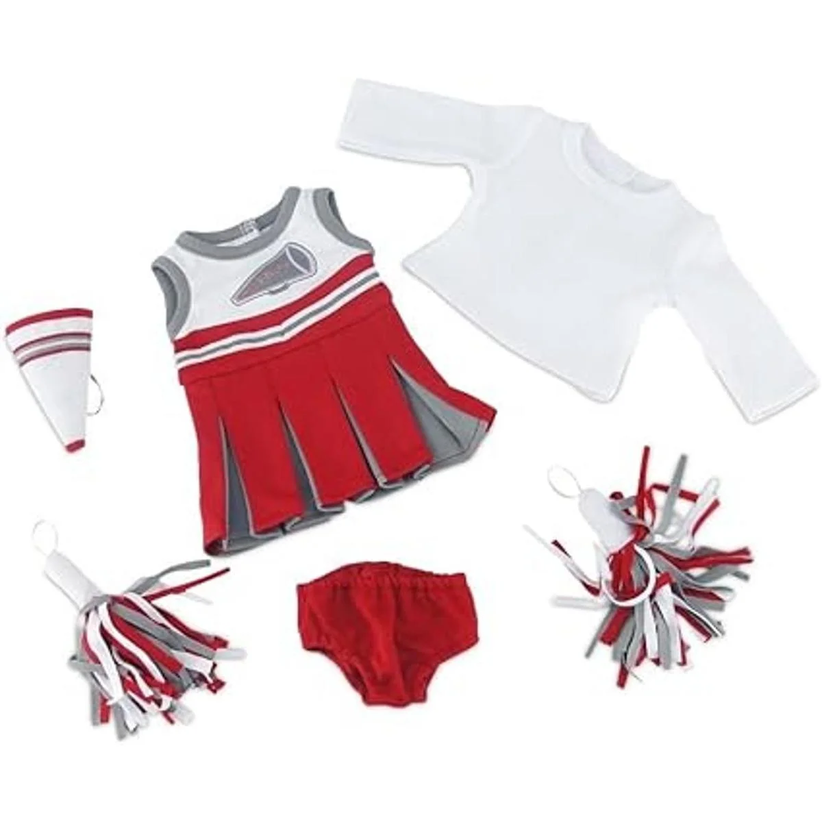 Ropa de muñeca de 18 pulgadas, increíble atuendo de animadora de equipo escarlata y gris, incluye vestido de animadora, camiseta de manga larga, pompones esponjosos y megáfono, se adapta a muñecas de niña estadounidense