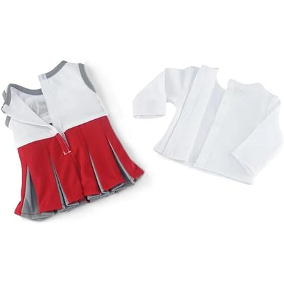 Súper fresco y divertido, el bonito vestido de animadora escarlata rojo, gris y blanco, tiene un montón de pliegues increíbles y emblema Go Team, añadiendo toneladas de espíritu escolar al armario de tu muñeca de 18 pulgadas