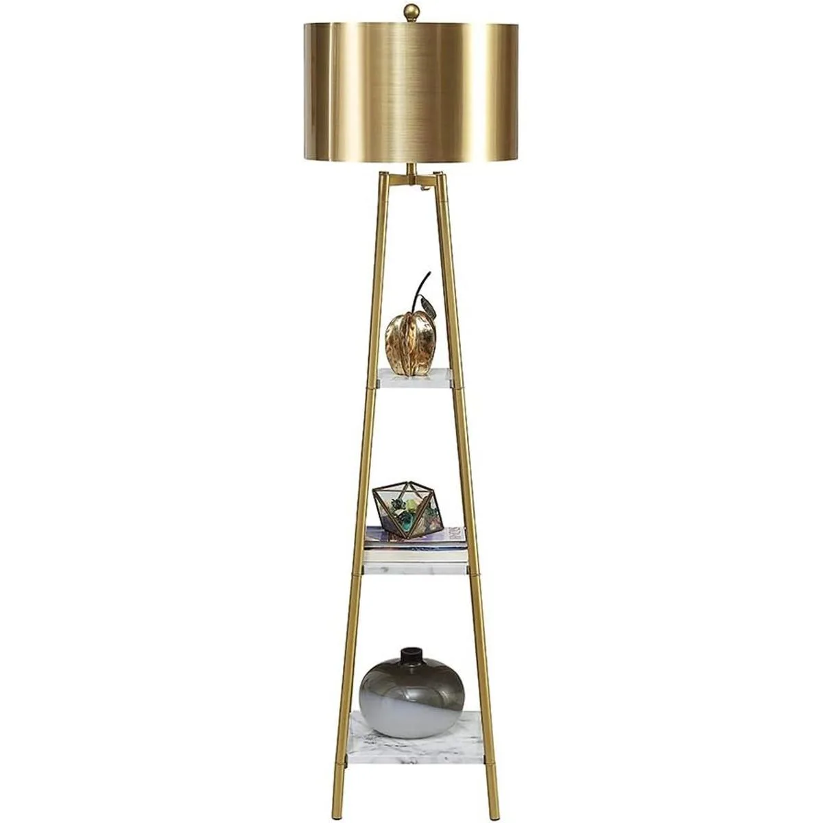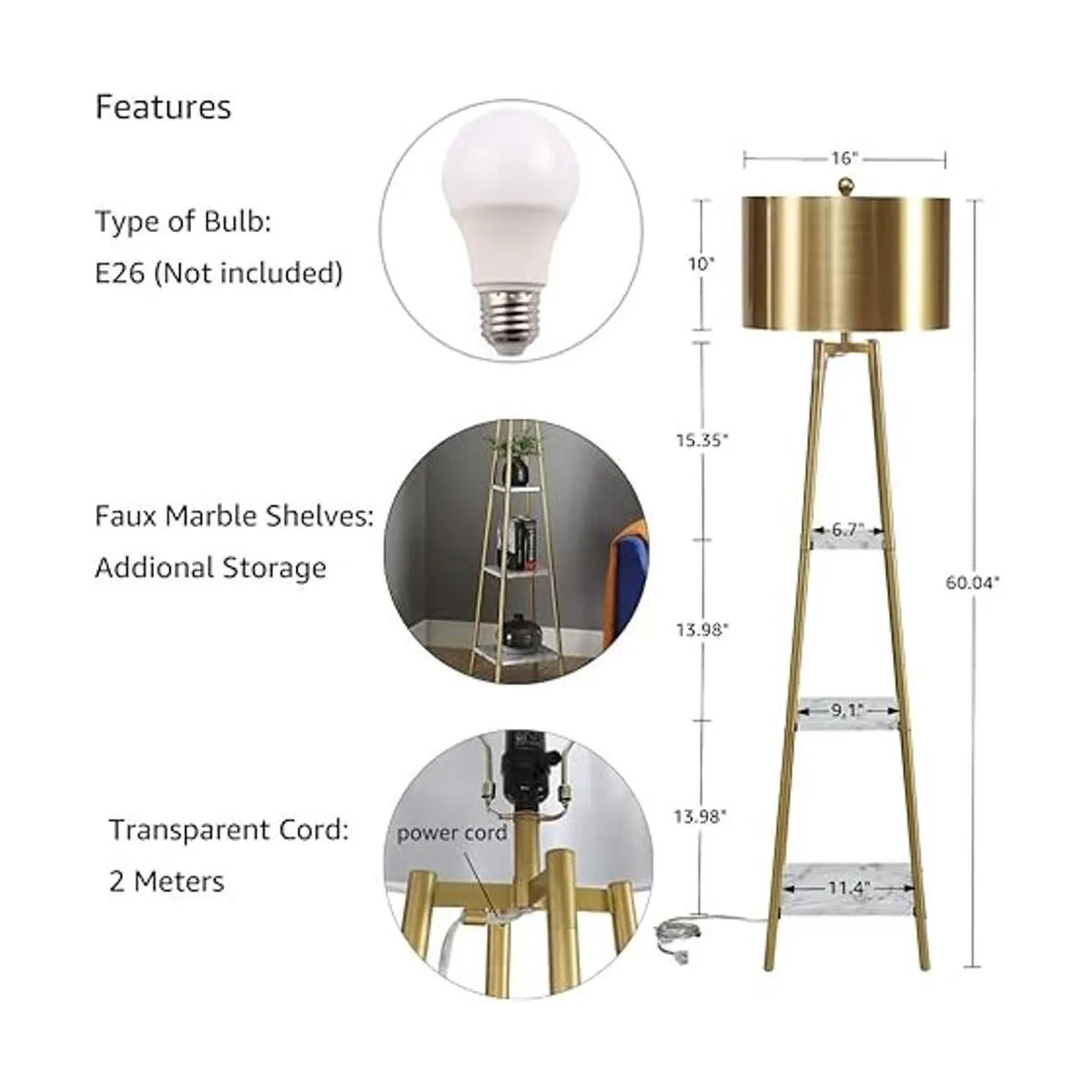 Estructura resistente: el simple marco dorado alberga tres niveles de estantes cuadrados de tablero de fibra con acabado de mármol blanco combina con una pantalla dorada para completar los prácticos muebles decorativos. La lámpara de pie es fácil de montar y el diseño del marco de metal es lo suficientemente estable como para garantizar la seguridad.