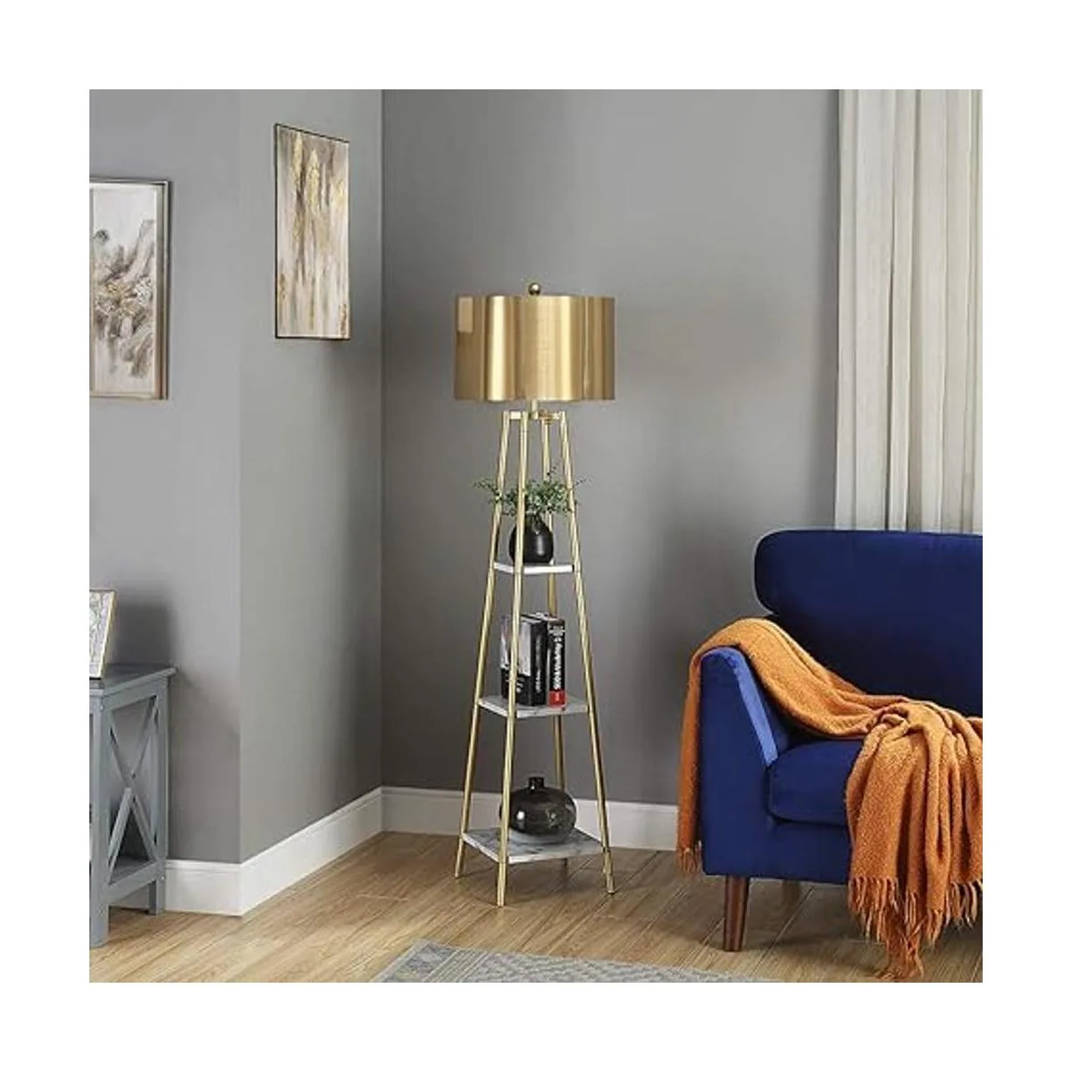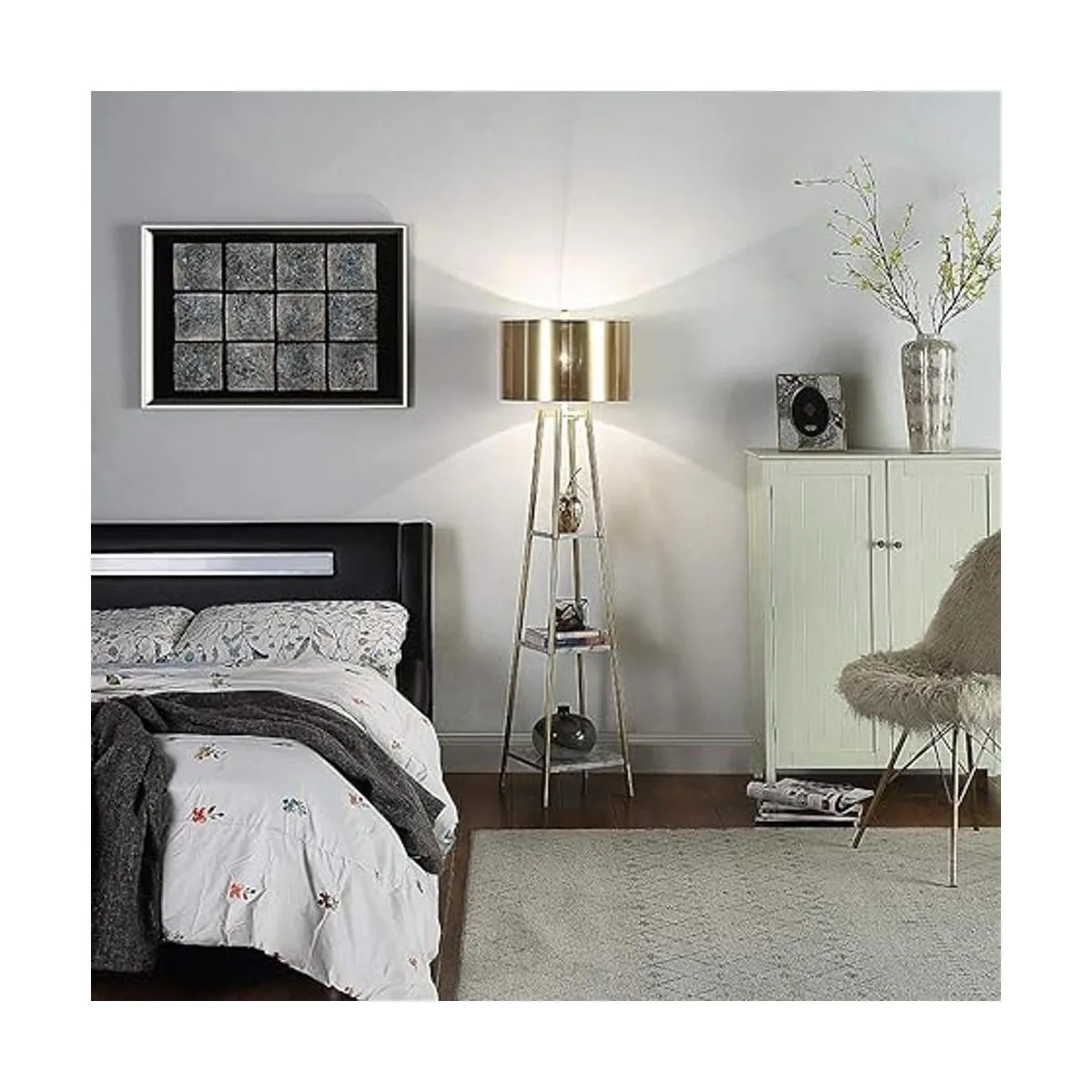 ROSEN GARDEN Lámpara de pie, luz de lectura de pie con estantes y pantalla dorada, lámpara moderna de poste alto, iluminación decorativa de muebles para sala de estar, dormitorios