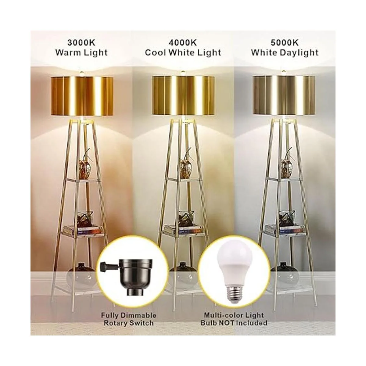 Lámpara de suelo de temperatura de 3 colores: requiere una bombilla estándar E26 o una bombilla LED de 3 temperaturas de color bombilla no incluida en el paquete, puedes controlar el brillo de tu lámpara de pie para dormitorio con la capacidad de ajustar la temperatura de color mediante interruptor giratorio.