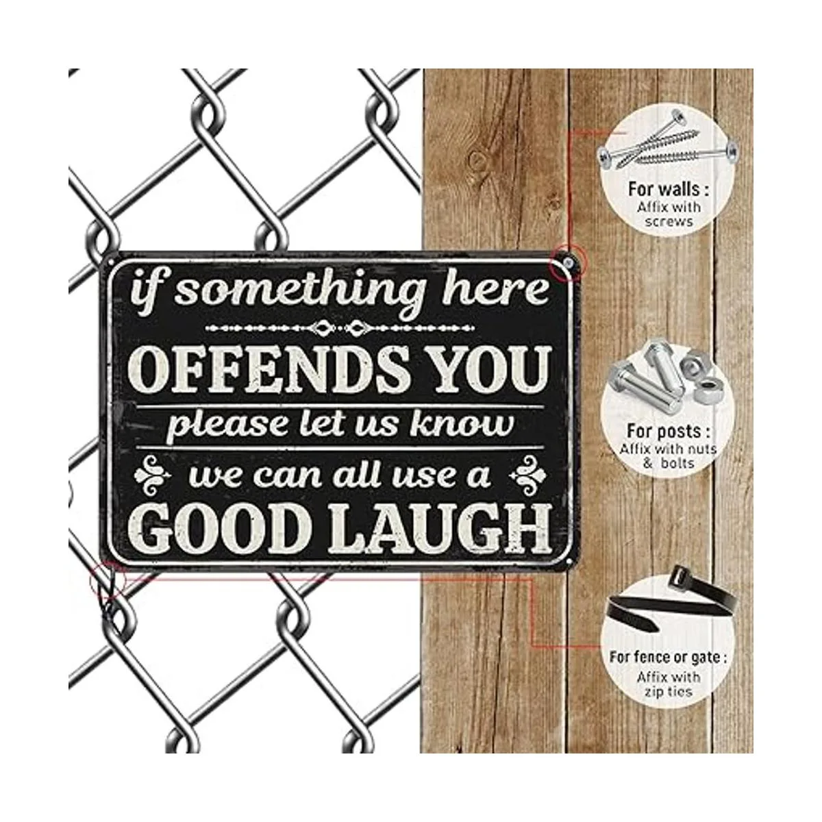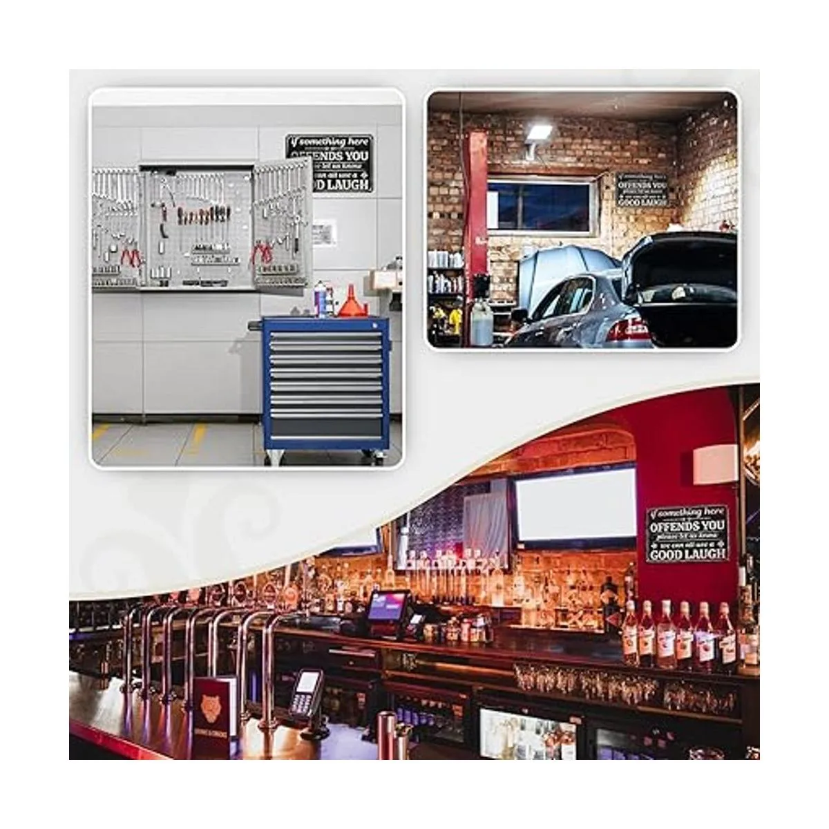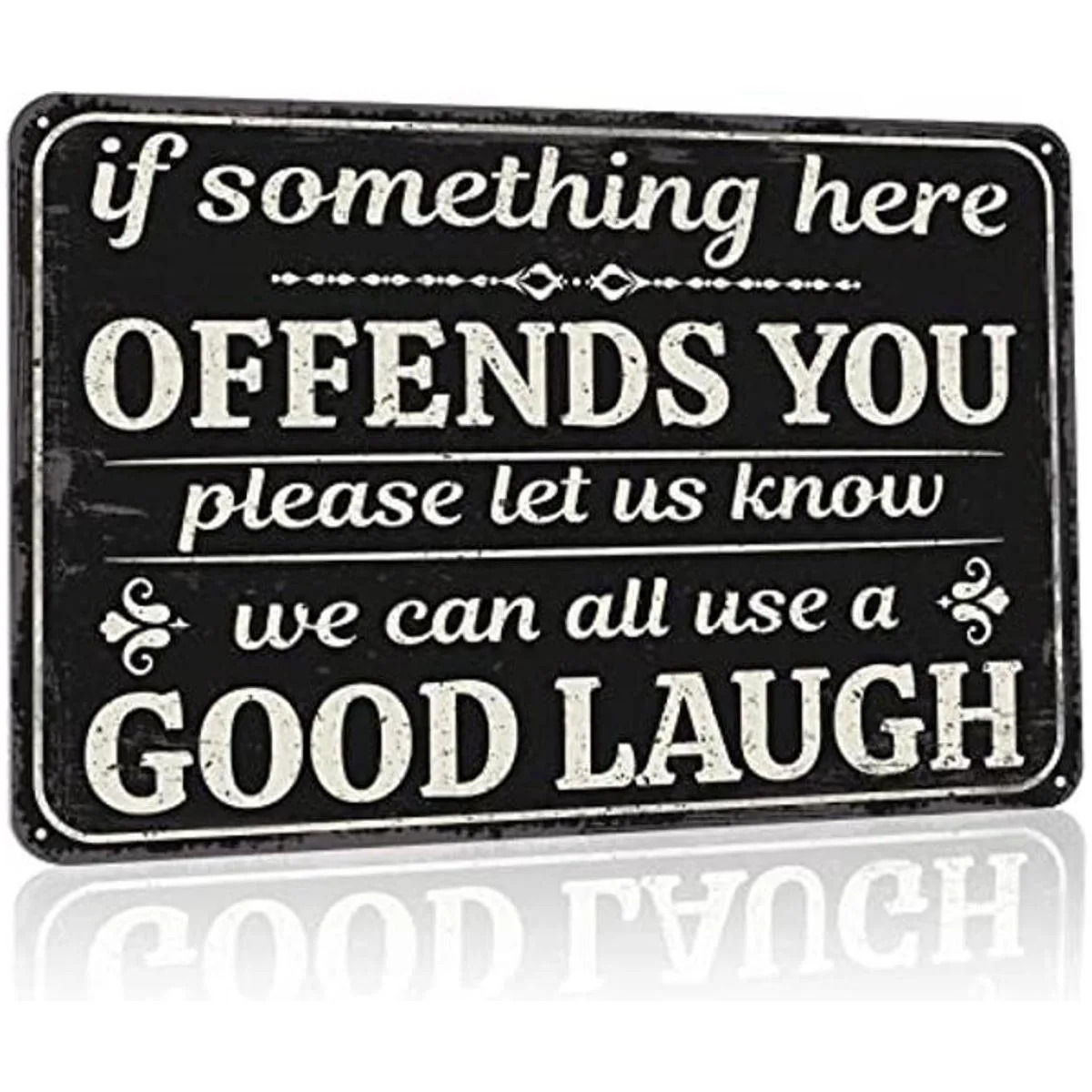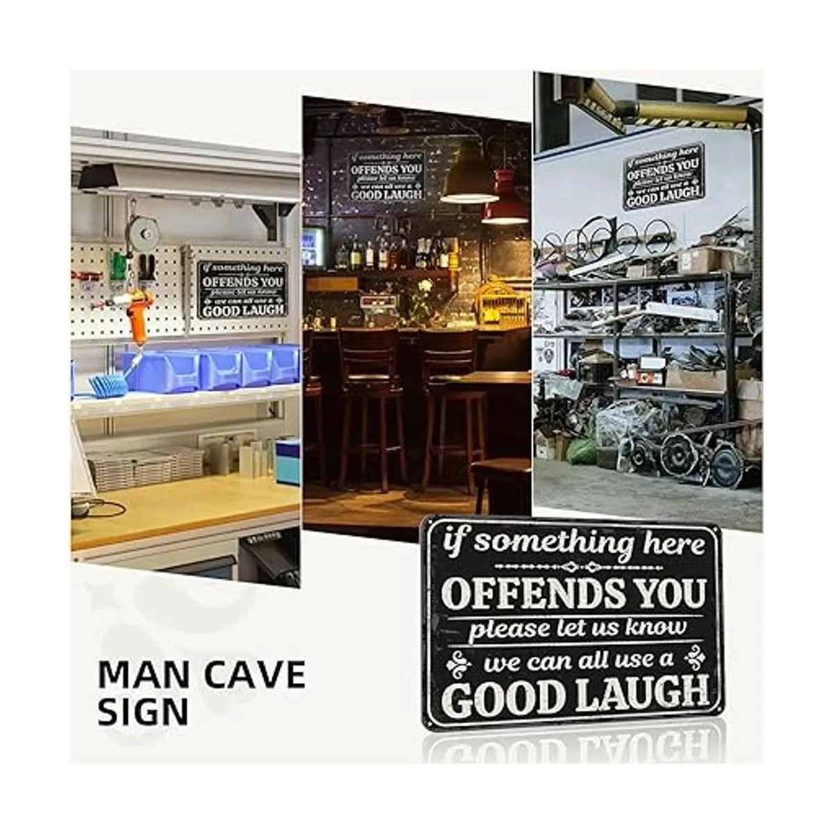 Rousen Letreros de metal para decoración de cuevas de hombre, divertidos letreros de estaño vintage sarcástico, adecuados para el hogar, bar, patio, caravana, cocina, oficina, letrero de aluminio de 12 x 8 pulgadas, 4 agujeros para colgar fácilmente, si algo aquí ofende por favor, déjanos saber que podemos usar una buena risa