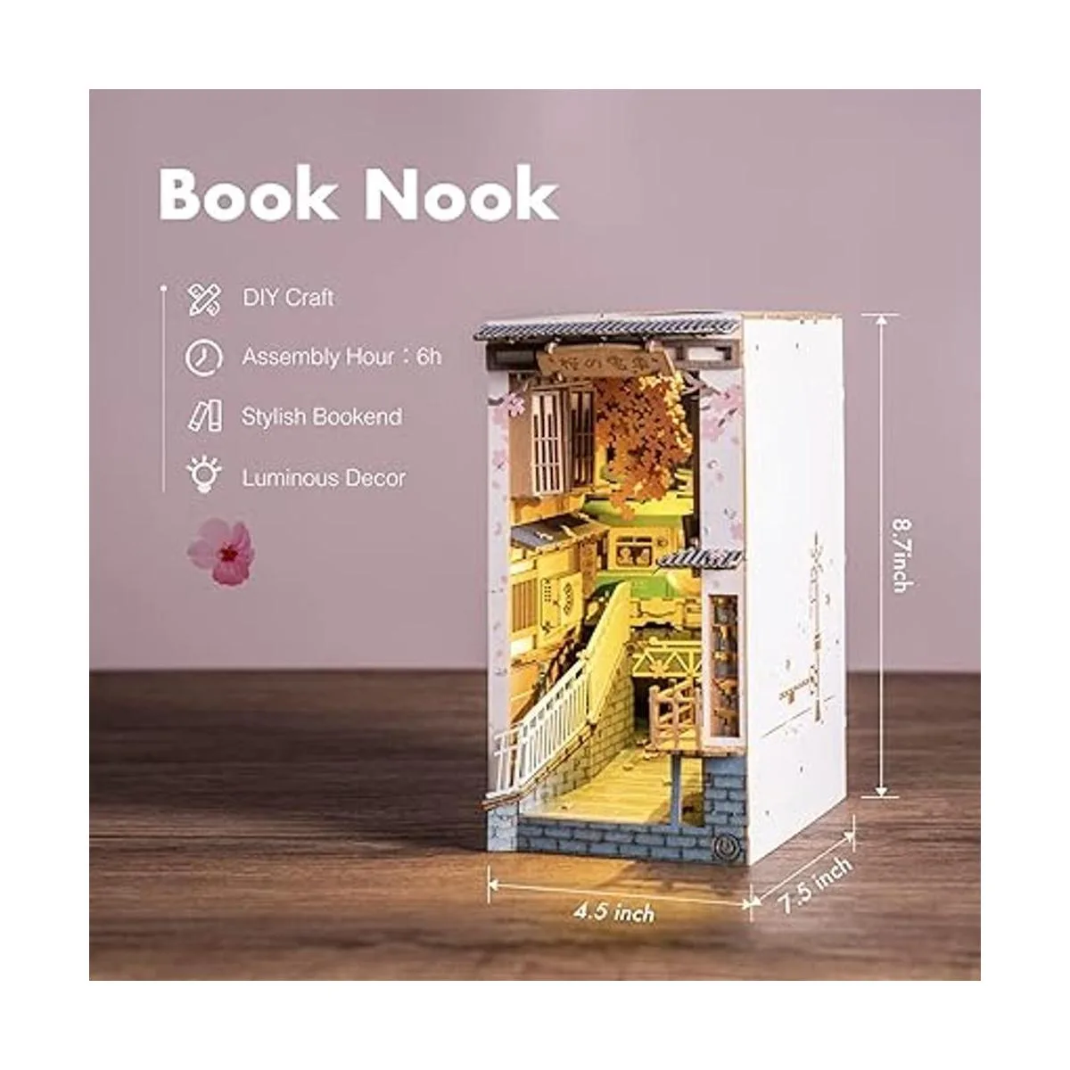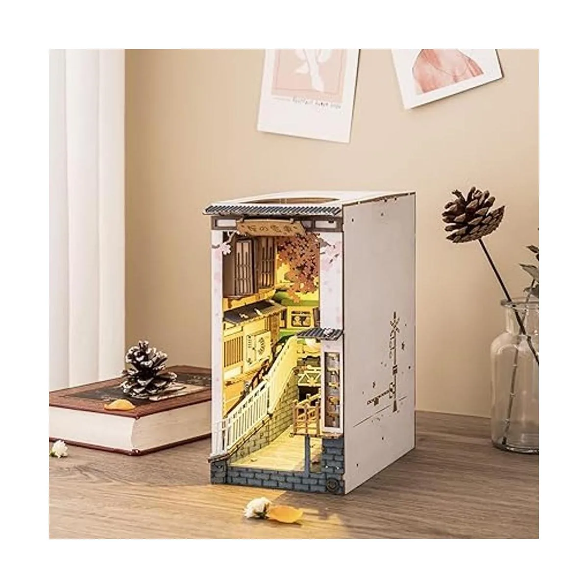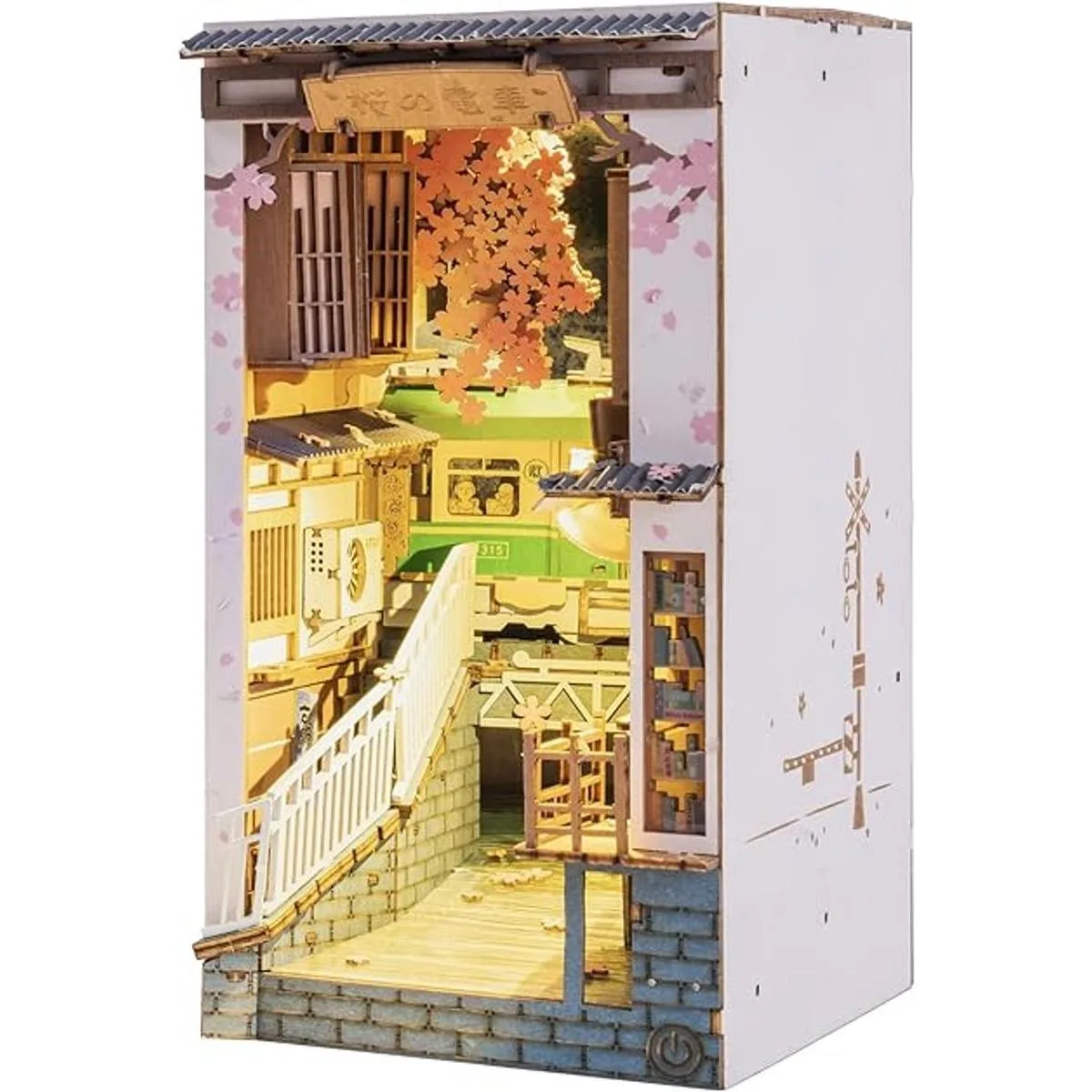 Rowood Kit de rincón de libros, decoración de estantería, rompecabezas de madera 3D, juego de construcción de sujetalibros de bricolaje, kit de modelo con luz LED, tranvía Sakura