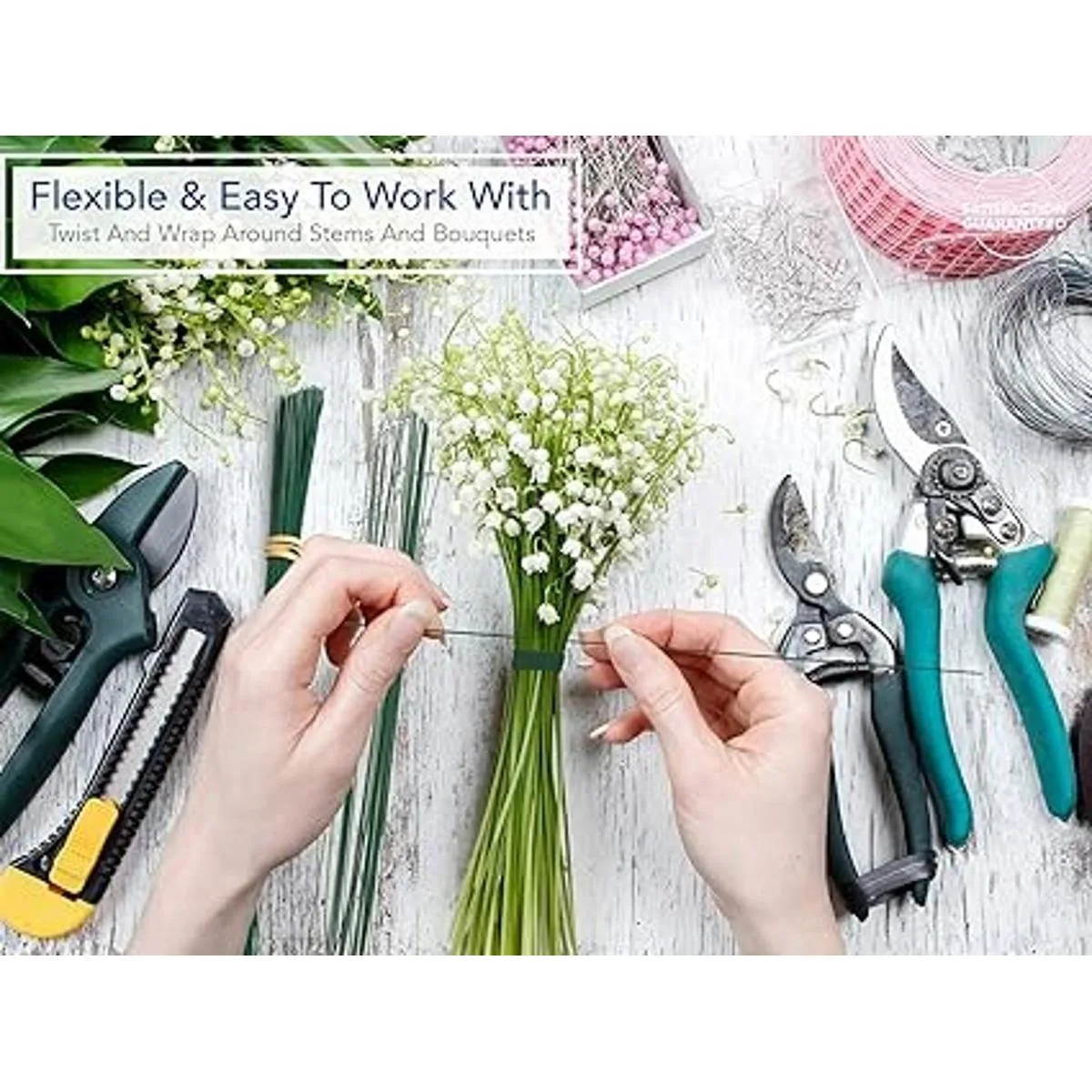 Flexible: estos tallos de alambre pesados, aunque son muy fuertes, son extremadamente flexibles, por lo que se pueden envolver fácilmente incluso alrededor de los tallos de forma más complicada. Es flexible pero no se rompe rápidamente. Viene listo en piezas cortadas de 12 pulgadas que hacen que sea fácil de usar mientras organizas ramos florales.