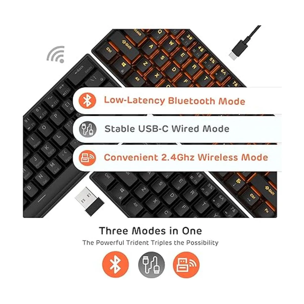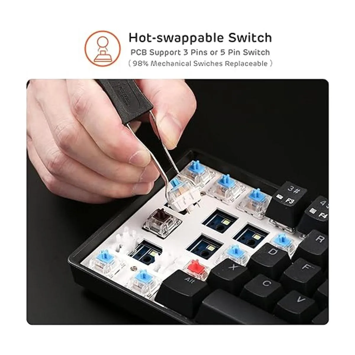 multidispositivo y conectividad: rk61 Dual es un teclado mecánico universal con 61 teclas para escribir en todos sus ordenadores o dispositivos móviles que soporte Bluetooth teclados externos con perfil HID, como, computadora portátil, tablet, smartphone. RK 61 es también con conectividad USB. rk61, además, puede conectar hasta tres dispositivos simultáneamente y puede cambiar entre ellos fácilmente al hacer clic en el botón de Fn Q, FN W o Fn E.
