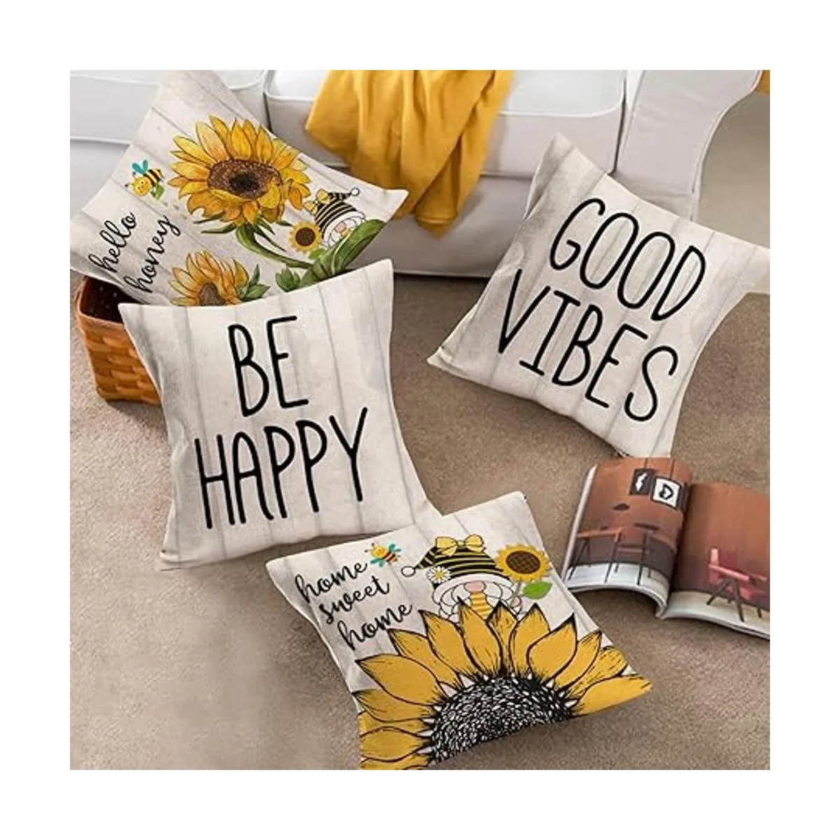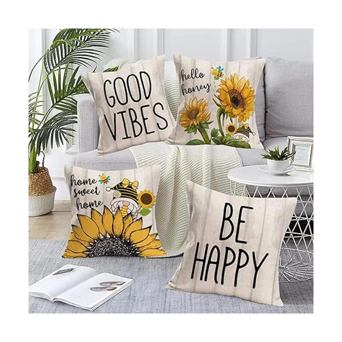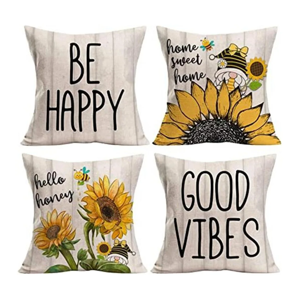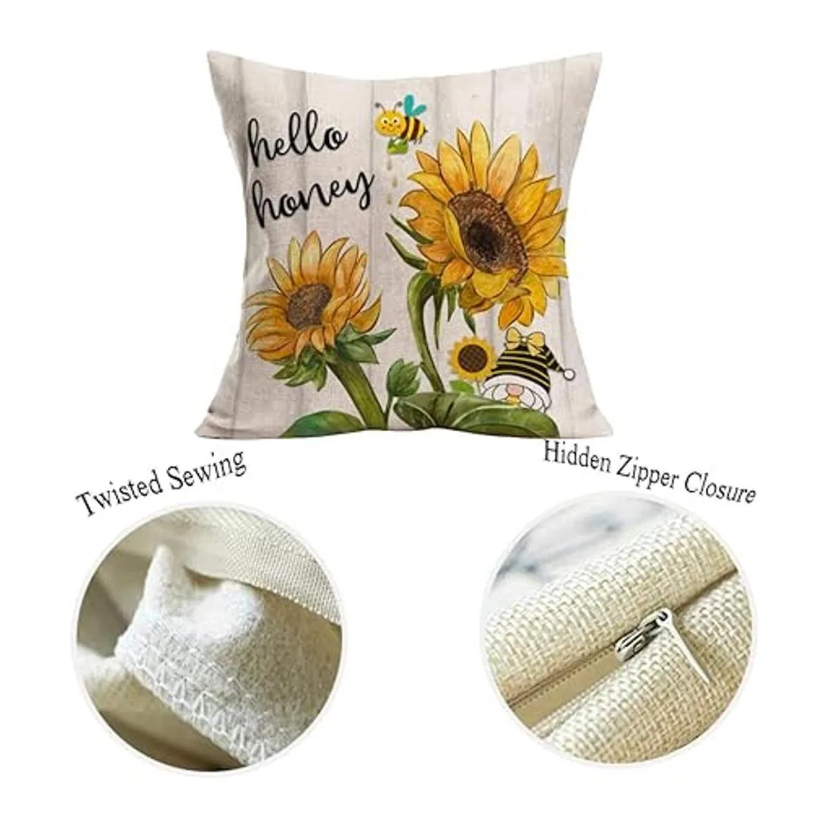 Royalours Home Sweet Home Juego de 4 fundas de almohada rústicas de girasol de 18 x 18 pulgadas, juego de 4 fundas de almohada de granja de gnomos de abeja de algodón y lino al aire libre amarillo floral para sofá