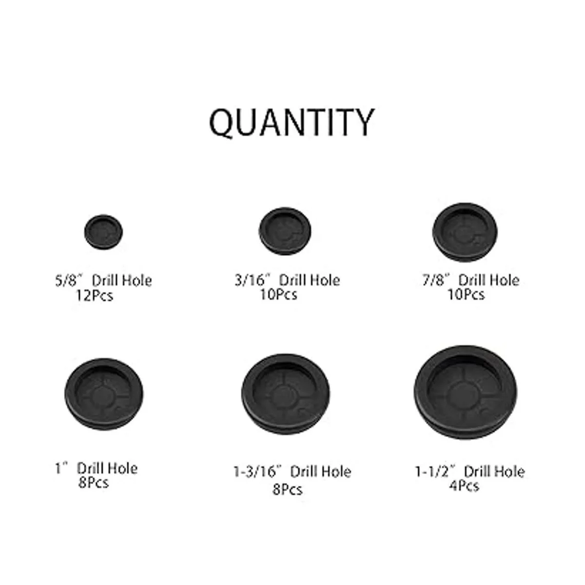 Cantidad de embalaje: agujero de taladro de 5/8 pulgadas 12 unidades, agujero de taladro de 13/16 pulgadas 10 unidades, agujero de taladro de 7/8 pulgadas 10 unidades, agujero de taladro de 13/16 pulgadas 8 piezas, agujero de taladro de 11/2 pulgadas 4 piezas.