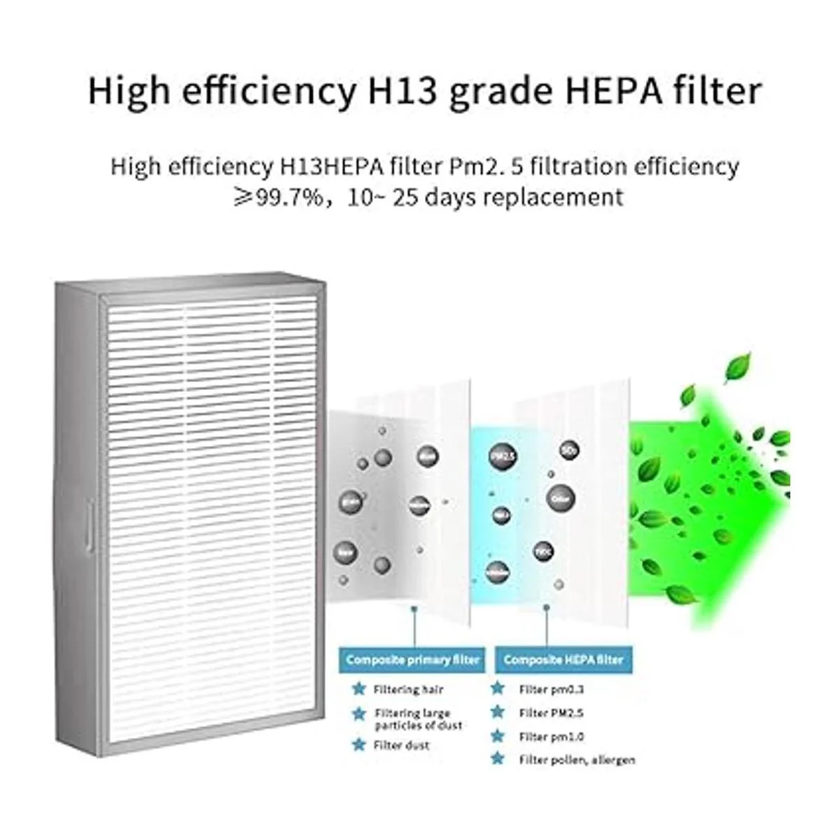 Filtro HEPA H13 de alta eficiencia, filtra PM2.5 por 99.9. El filtro debe ser reemplazado cada 500 horas