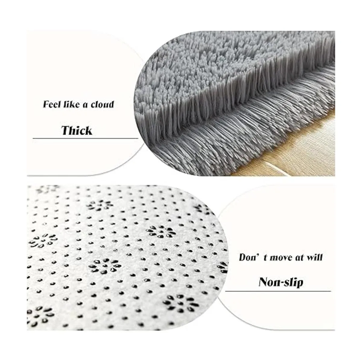Nonslip Bottom The nonslip backing of the shag bedroom rug is covered with thousands of plastic grip dots, so that the carpet can always stay in place, doesnt move around on the floor.