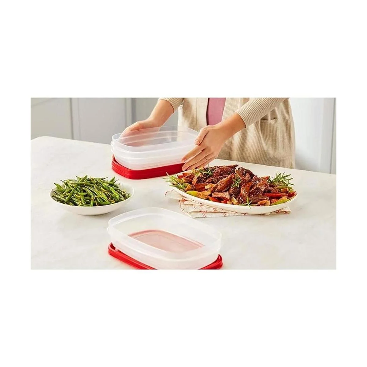 No más tapas perdidas: el sistema EasyFindLids mantiene tu cocina organizada: las tapas y las bases se juntan, los recipientes modulares de alimentos se apilan fácilmente, las bases se anidan juntas, y una tapa se adapta a múltiples bases, ahorrando espacio en nevera y armarios