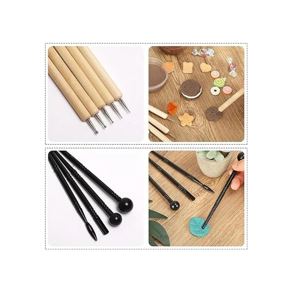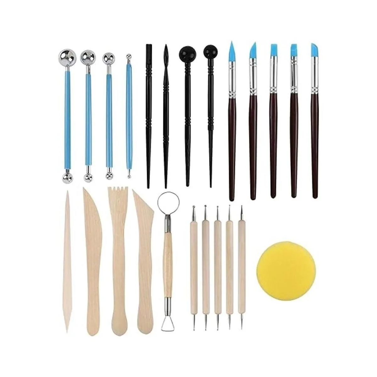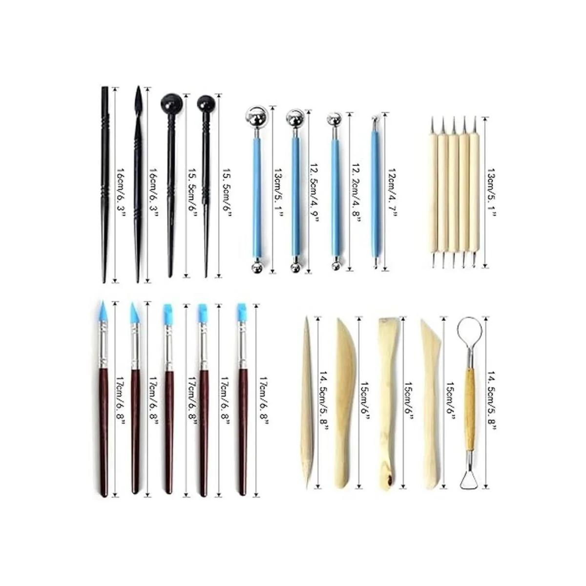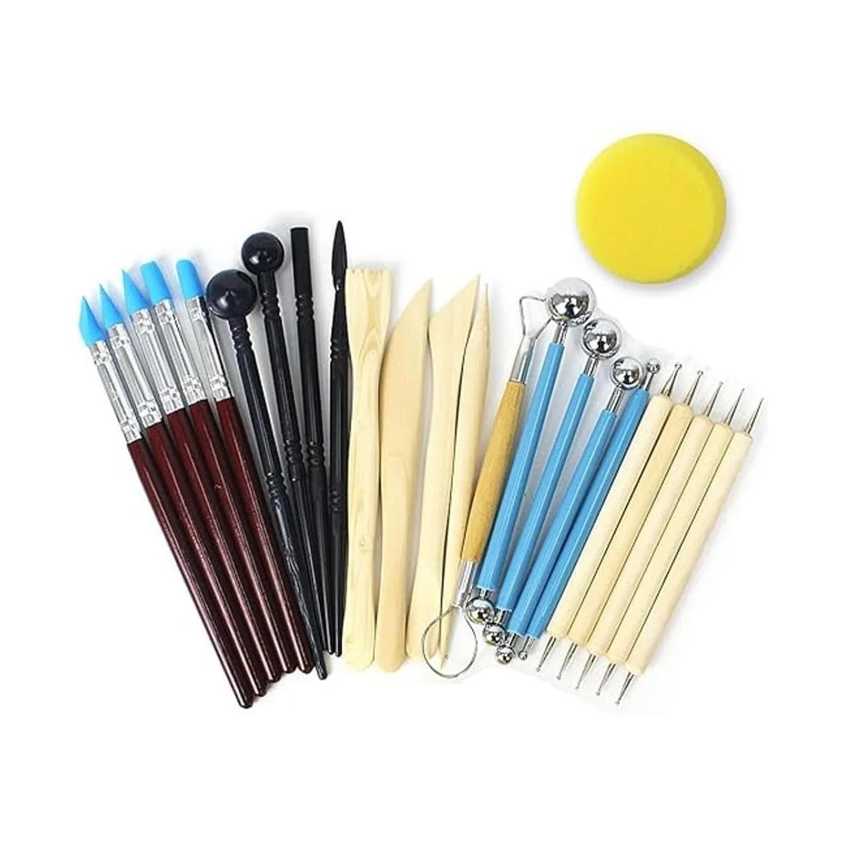 El paquete incluye: 5 herramientas de arcilla de madera, 5 lápices de bola de mango de madera, 5 bolígrafos de goma, 4 lápices de bola de mango de goma, 4 lápices de plástico, 1 esponja de cerámica.